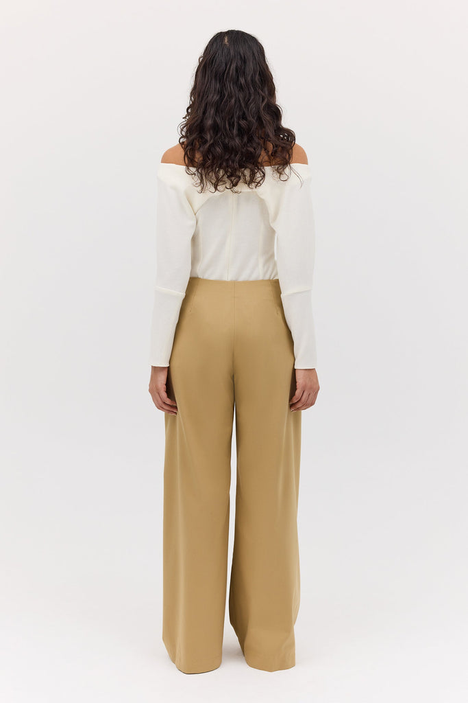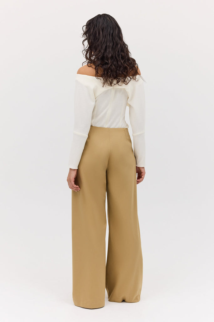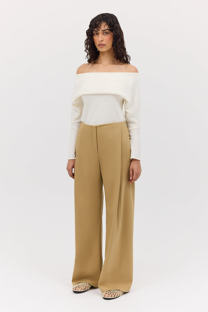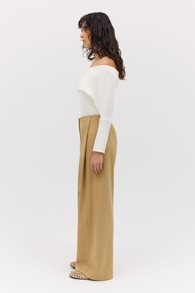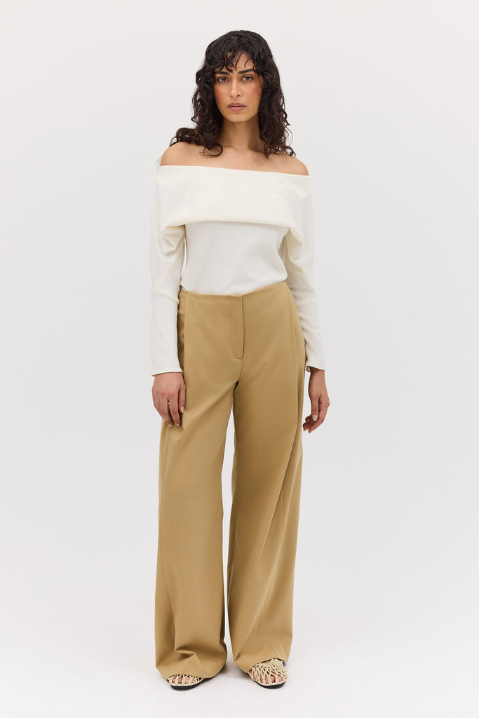 A refined take on relaxed dressing, the Bianca Spender Cream Wool Jersey Bijou Top reimagines the classic t-shirt with sculptural elegance. Crafted in soft wool jersey, its off-the-shoulder neckline and longline silhouette offer versatility and understated sophistication.