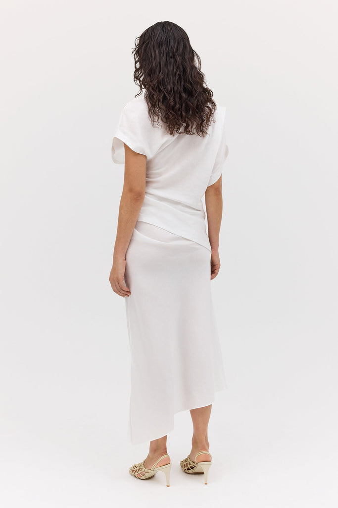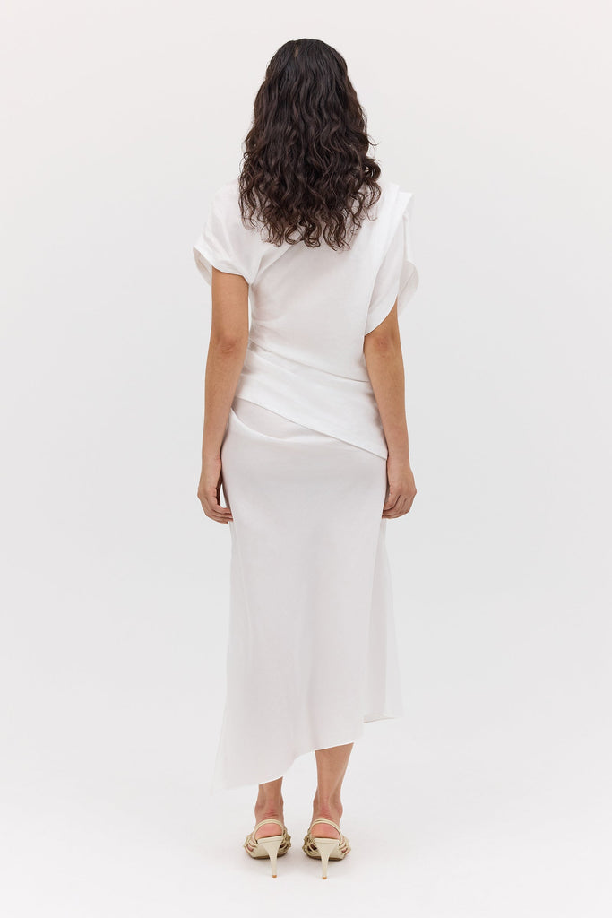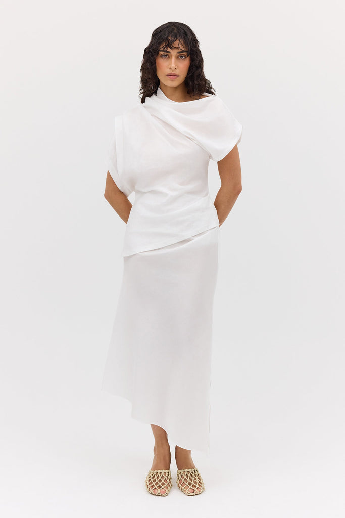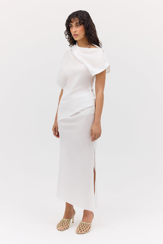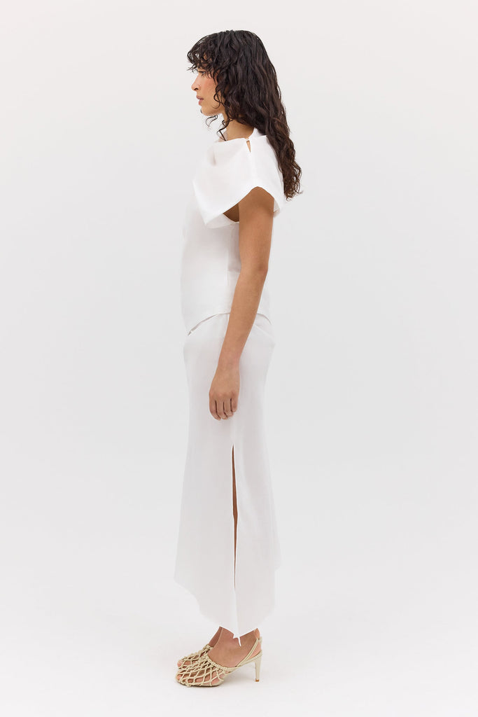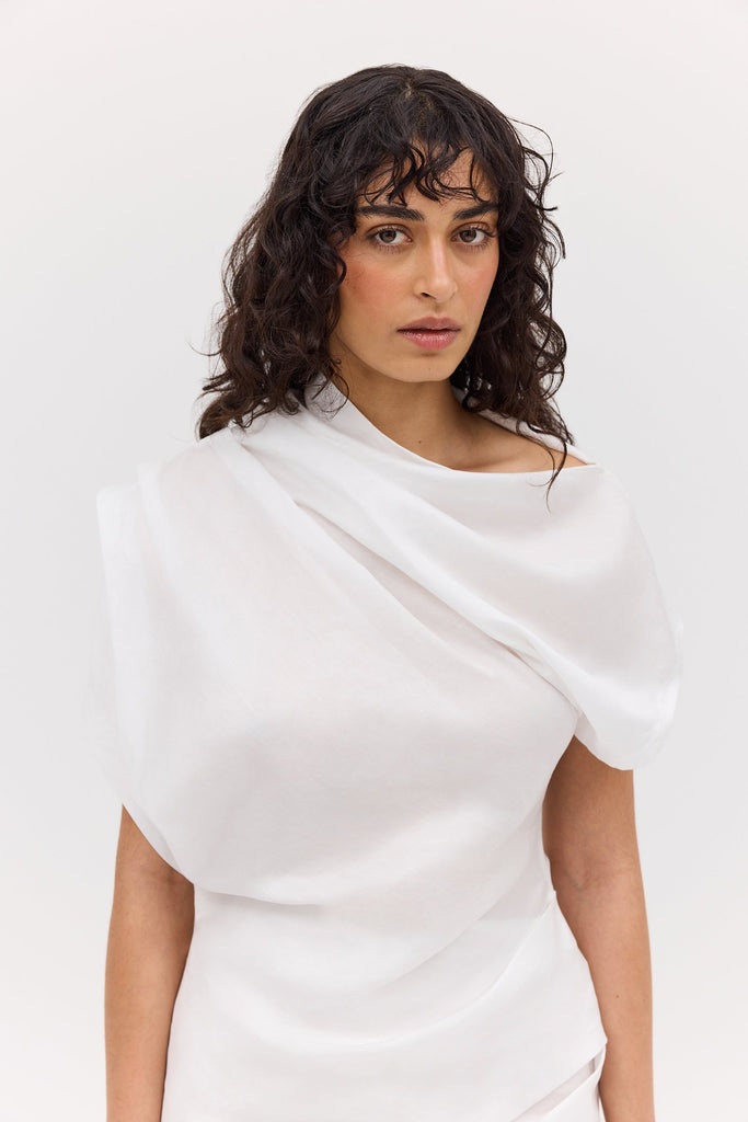 A study in asymmetry and structure, the White Cotton Decode Top explores the contrast between concealment and revelation. Sculpted in organic cotton, the one-shoulder silhouette is elevated by origami-inspired folds that add dimension and fluidity. Voluminous sleeve detailing brings drama to a piece that balances edge and elegance.