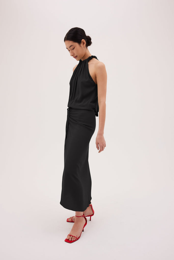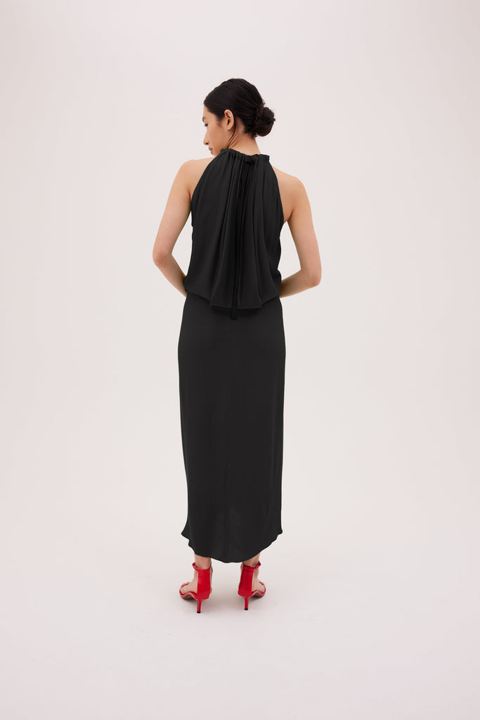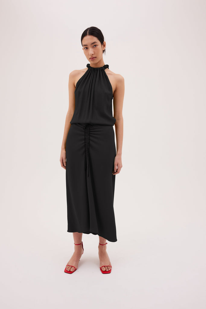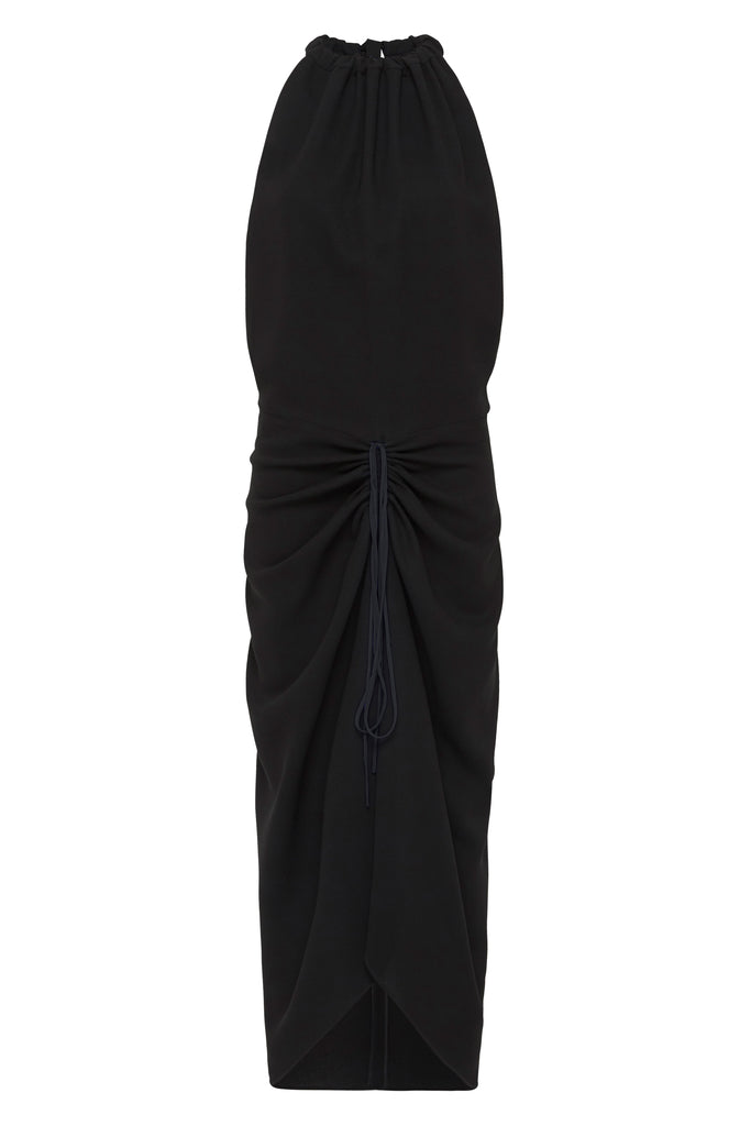 A classic black crepe update on a timeless favourite. This sleeveless midi dress features a gathered drawstring neckline and ruched detailing through the skirt, finished with an asymmetrical hemline for a softly sculptural silhouette.