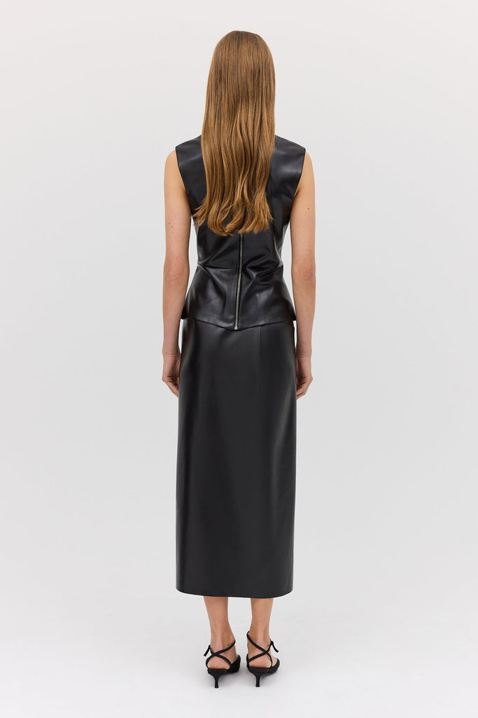 The Black Leatherette Illusion Top is crafted from cruelty-free vegan leather, cut to contour the body with a sculptural, figure-defining fit. A fixed twist detail at the front creates dimension, while the round neckline and sleeveless silhouette offer clean, modern lines. Finished with an invisible zip at the back.