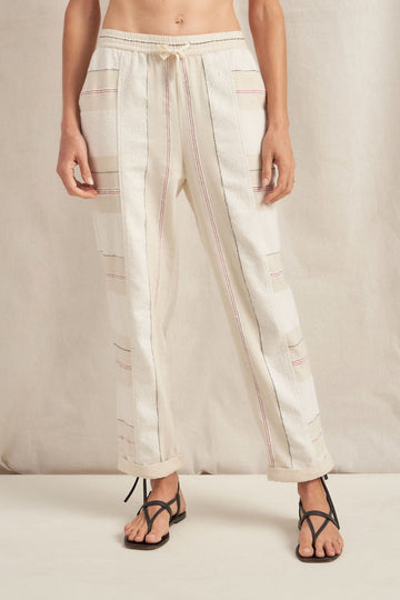 The Cadmus Pants in Cream Boucle Stripe are a relaxed essential elevated through texture and craft. Handloomed from BCI cotton, they feature a soft drape and boucle stripe detail for everyday ease.