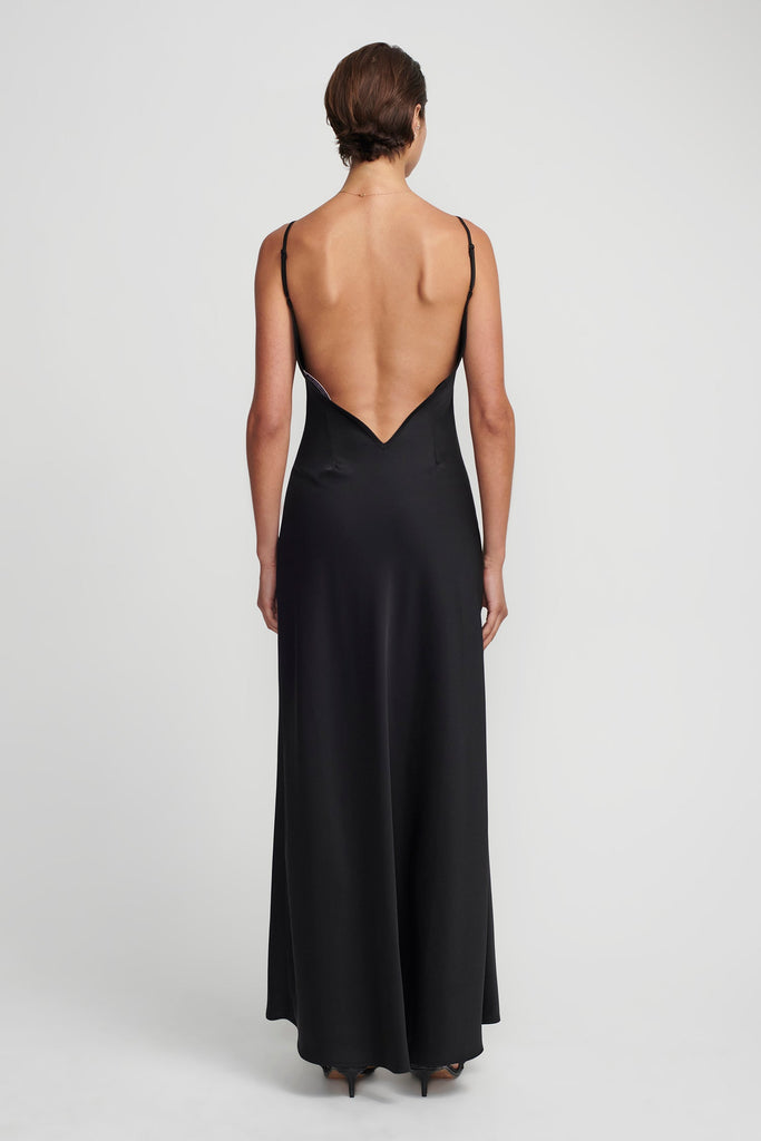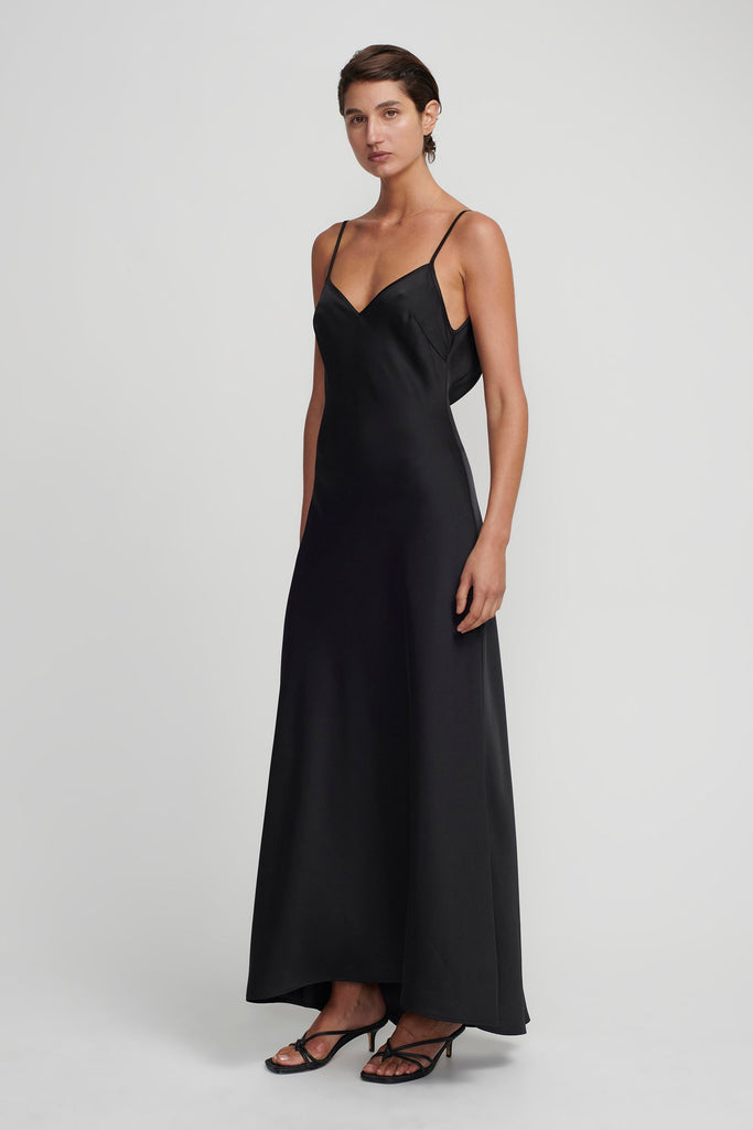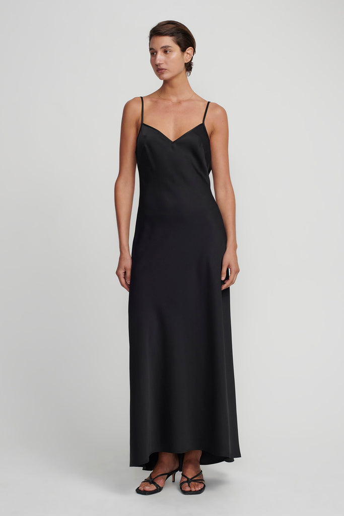 The Essential Slip in Black is a foundational piece designed for seamless layering. Its minimalist cut and fluid drape offer versatility beneath sheer garments or worn on its own.