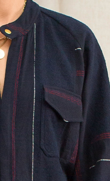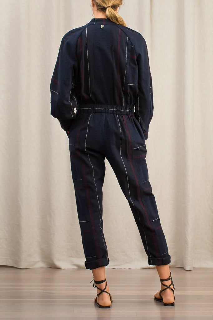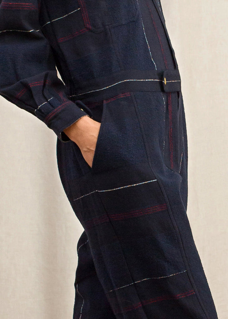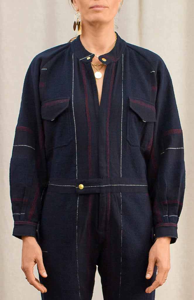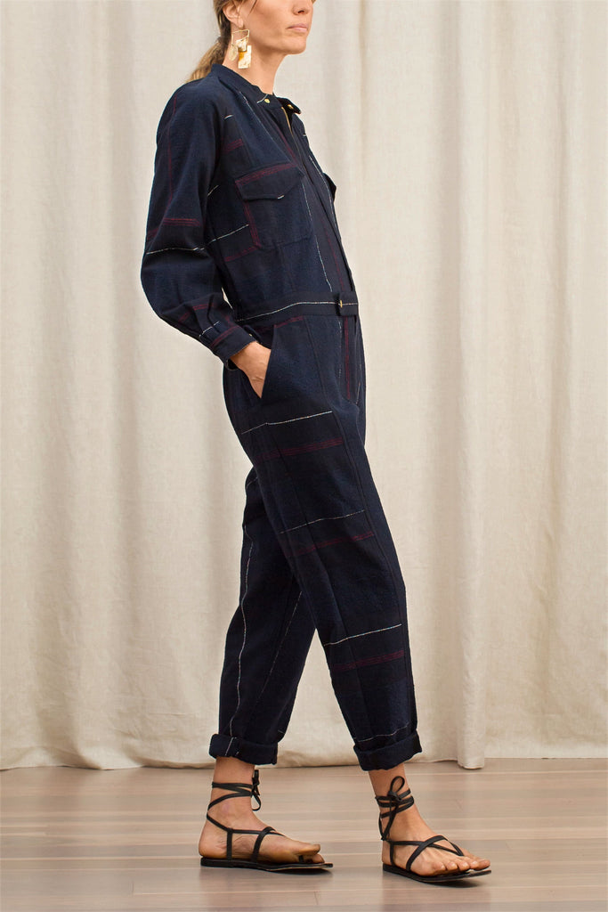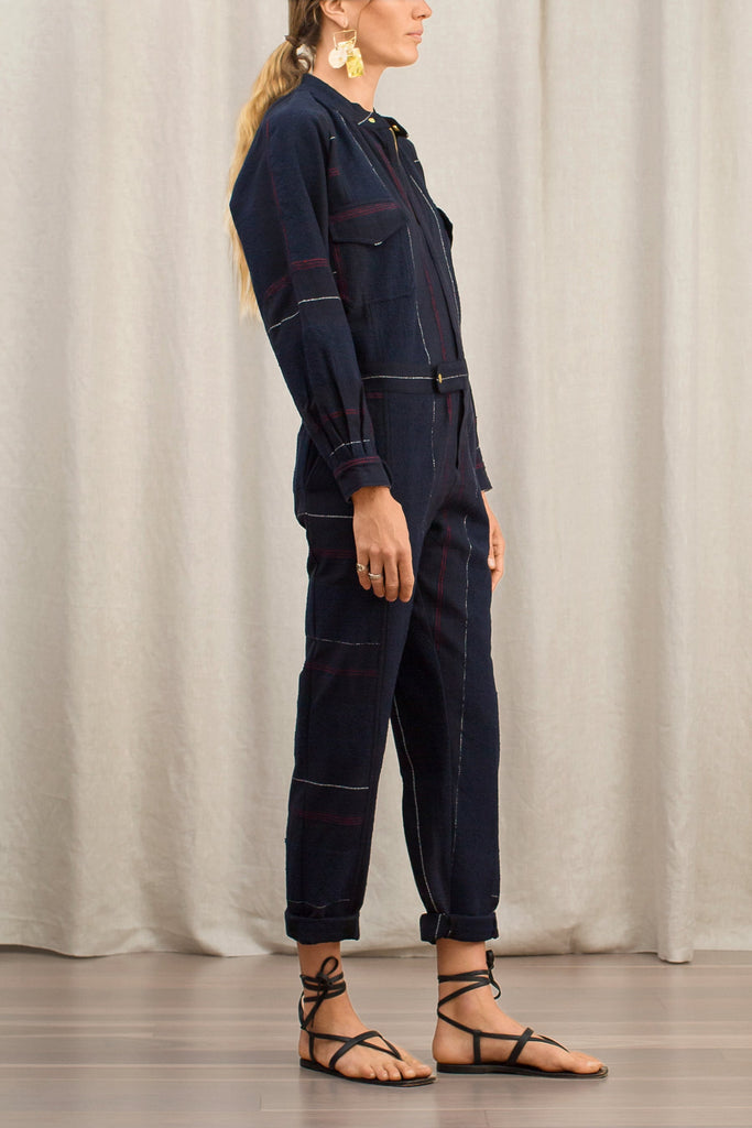 A utilitarian masterpiece with considered craftsmanship, the Navy Hephaestus Boilersuit is tailored in Ilio Nema’s signature navy stripe handloom. It strikes a poised balance between structured polish and tomboy ease for the modern wardrobe.
