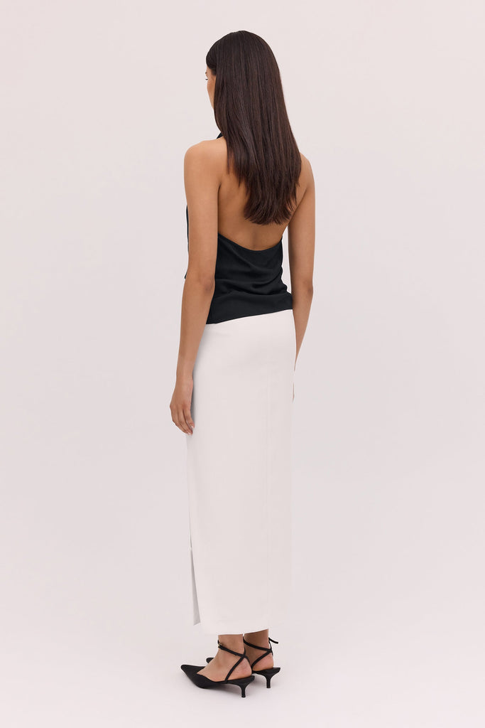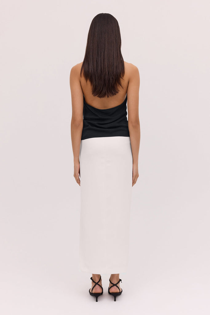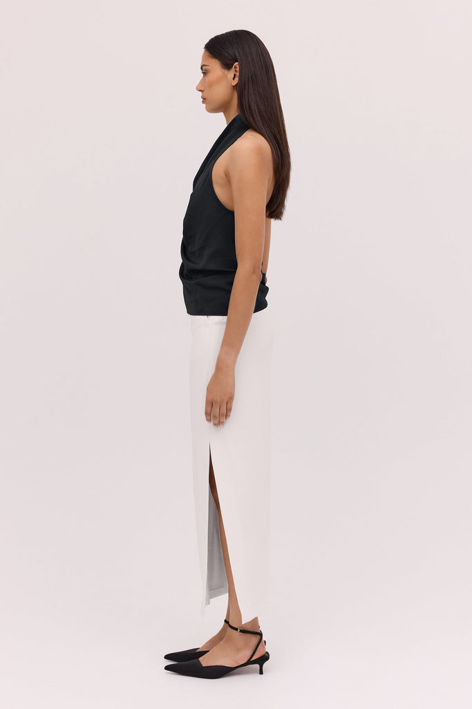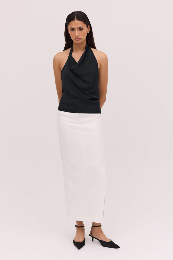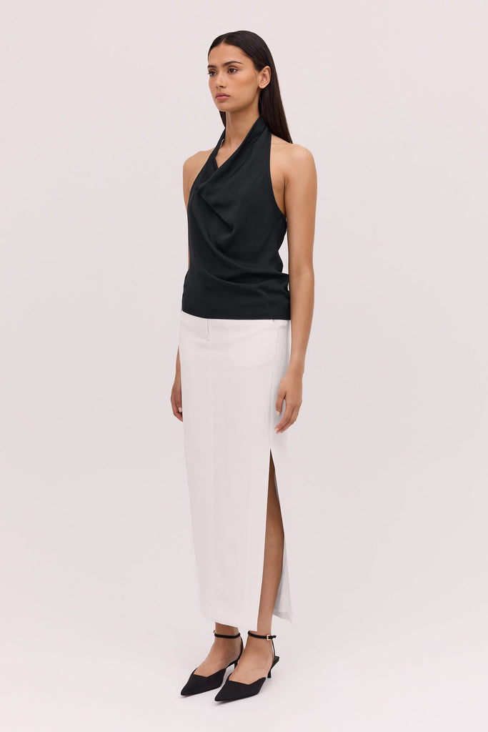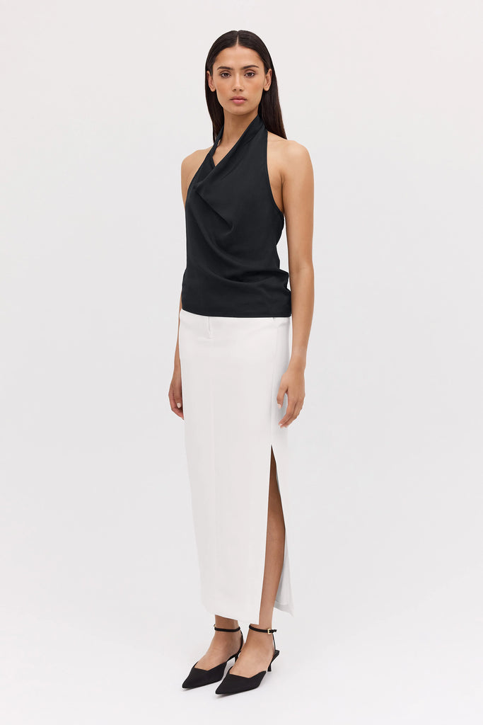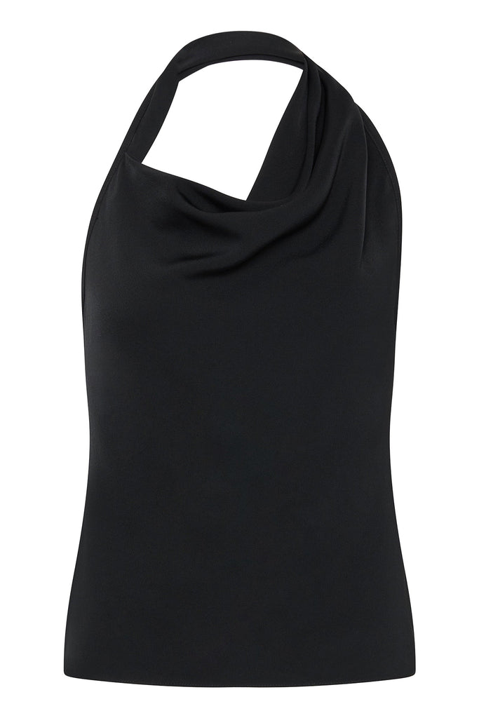 The Bianca Spender Black Satin Sync Top embodies refined modernity with its fluid drape and distinctive cowl-front design. Crafted from satin-viscose, it balances sculptural elegance and ease—perfect for polished ensembles.