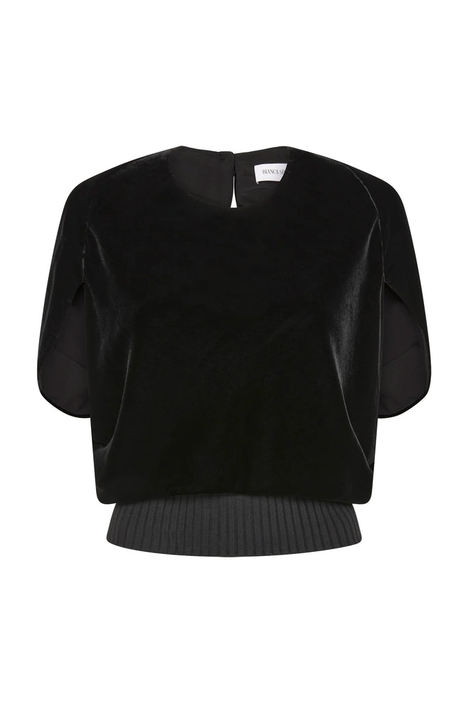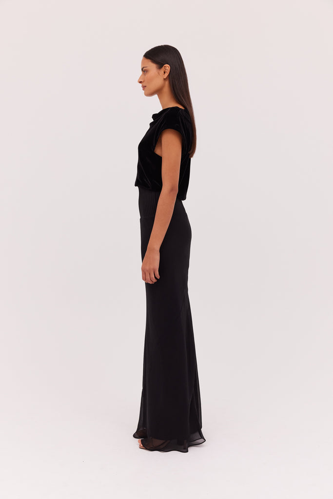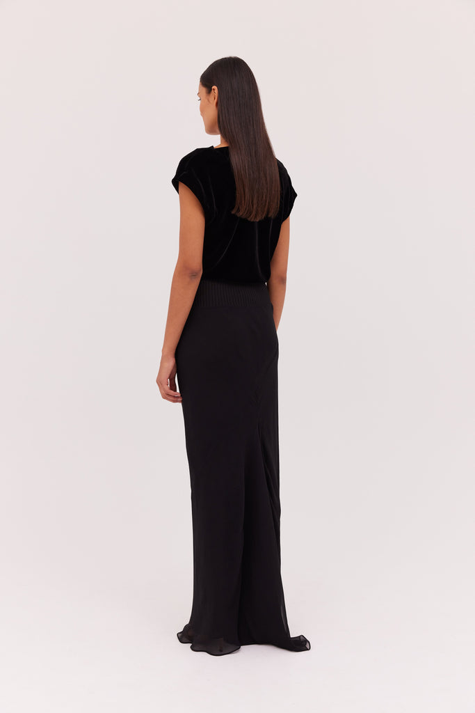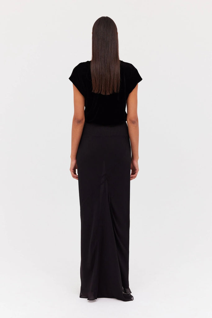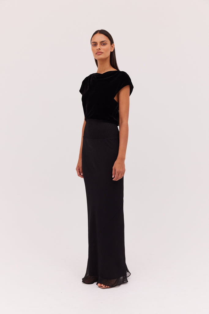The Black Velvet Crawford Top by Bianca Spender offers a refined take on eveningwear. Crafted in a rich silk-viscose blend, it drapes fluidly with subtle lustre and tactile depth—an elevated foundation for both structured tailoring and languid silhouettes.