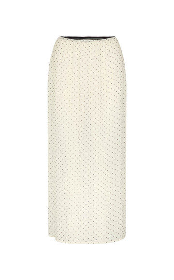 Lightweight and fluid, the Camilla Skirt by Harris Tapper is a refined take on feminine dressing. Crafted from 100% silk chiffon in a cream and black polka dot print, it moves effortlessly with the body, offering an ethereal silhouette. Designed to sit at the waist and fall gracefully to the ankle, this piece merges timeless elegance with contemporary ease.