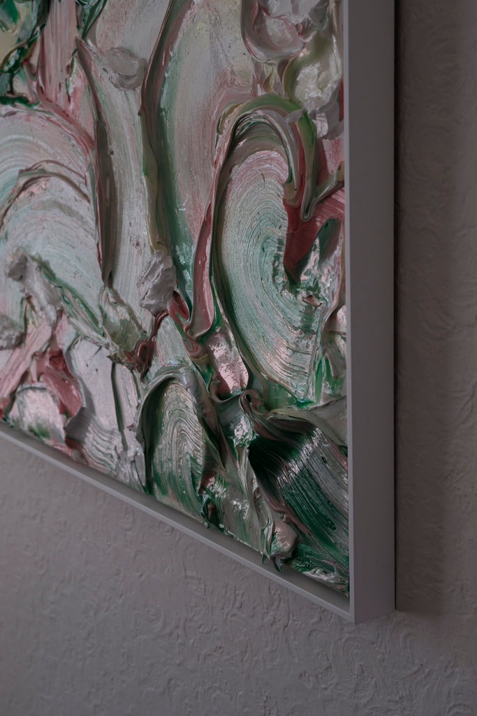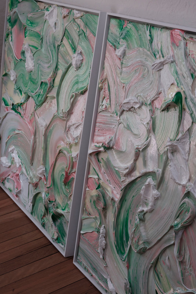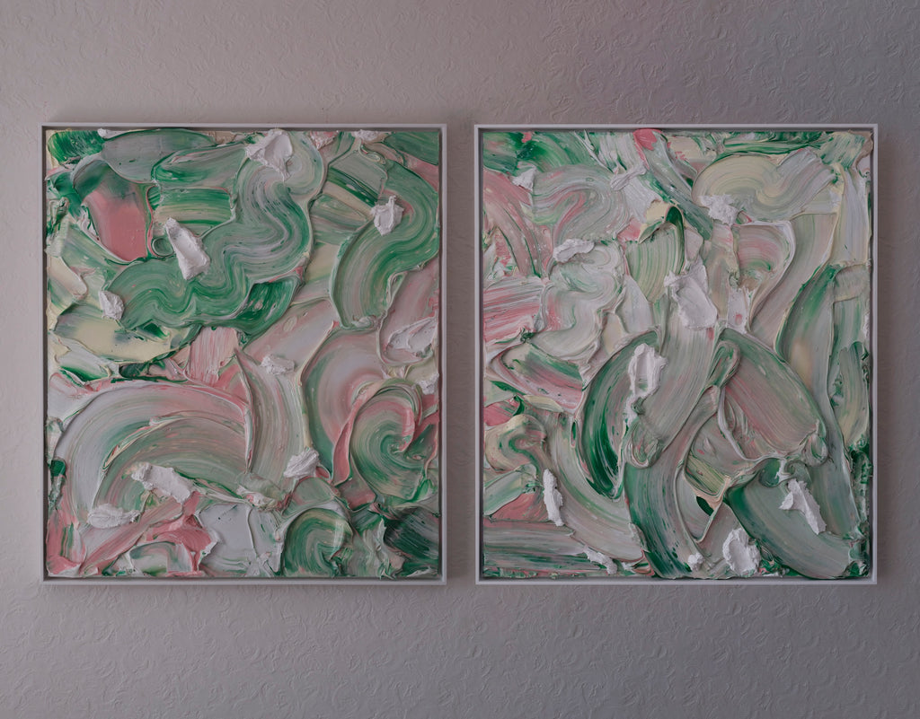 A Henryk diptych first, Sorbet #012is a soft yet unique colour palette in shades of green, yellow pink and white. These artworks can be purchased together or separately.