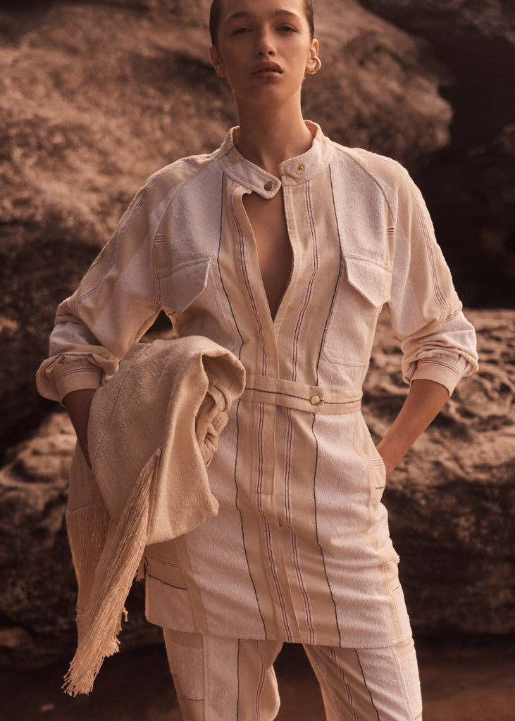 Effortlessly spirited, the Oceanus Cream Bouclé Stripe Mini Dress combines tactile handloom texture with a spring-ready silhouette. Poised yet playful, it’s an easy-to-wear wardrobe staple for on-the-go elegance.