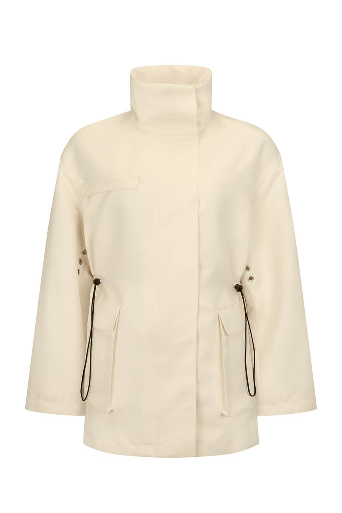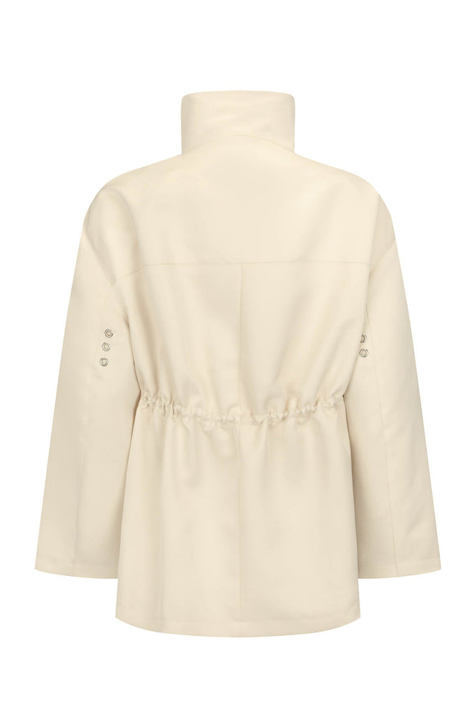 Features an elevated funnel neck framing the face with minimalist precision