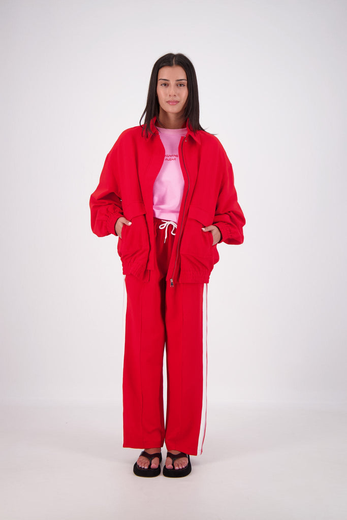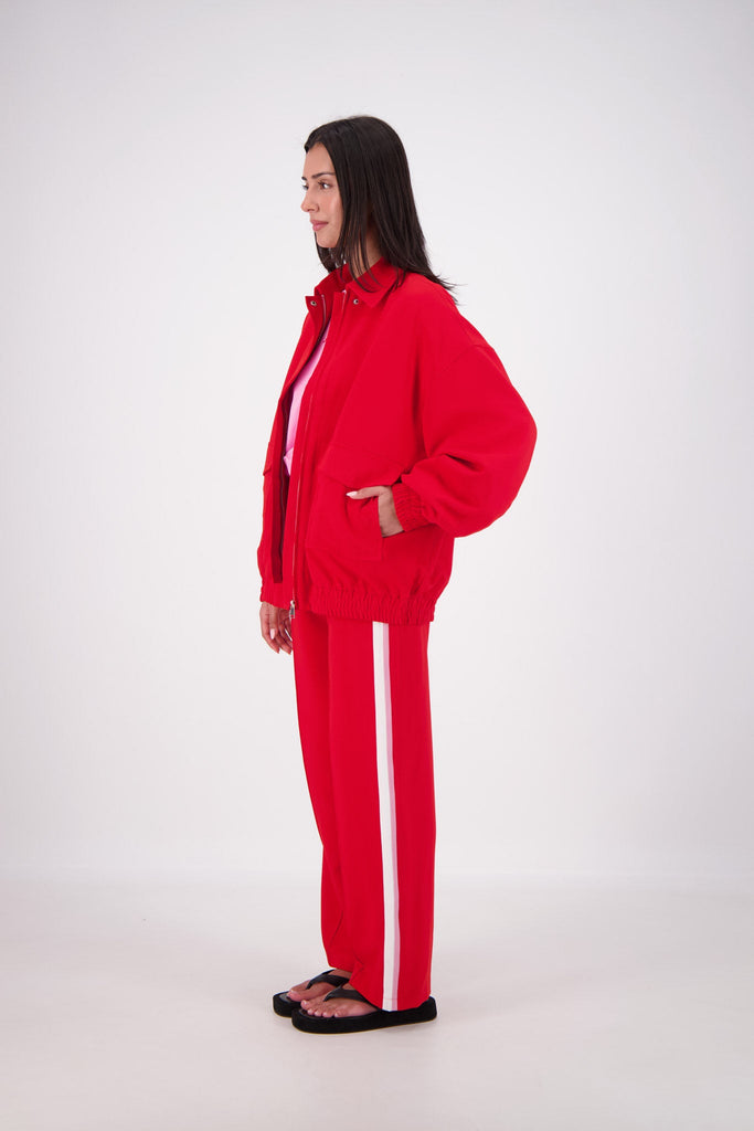 The Ischia Bomber Jacket in Red offers a bold yet versatile outer layer, designed with an oversized silhouette and considered detailing. Fully lined and structured with a soft drape, it merges everyday comfort with refined utility.