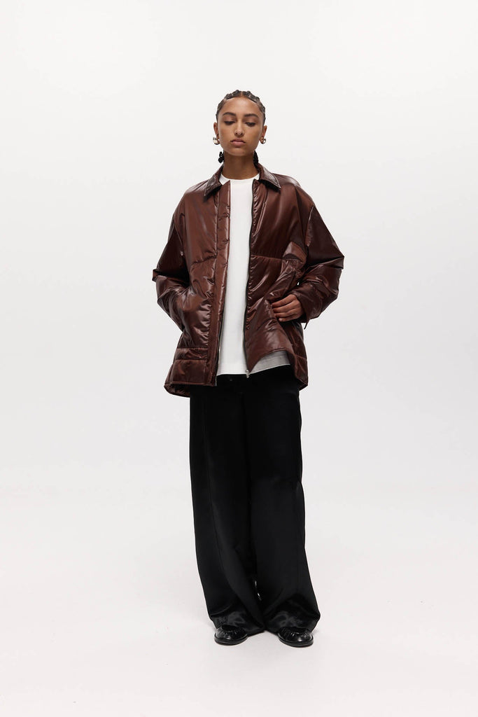 The Padded Bomber Jacket in Pecan is a softly structured silhouette crafted from satin nylon with a subtle sheen. Featuring a pointed collar, concealed zip and snap dome closure, it’s finished with horizontal seam detailing, wide cuffs and functional front pockets for a refined take on a classic outerwear shape.