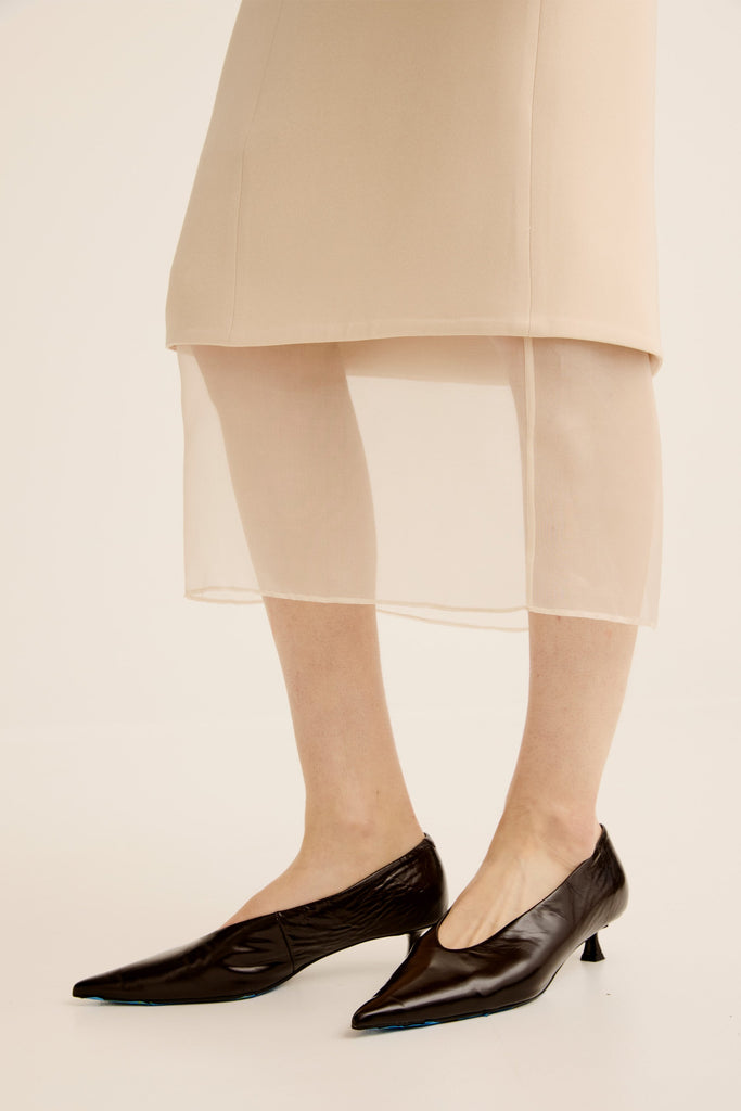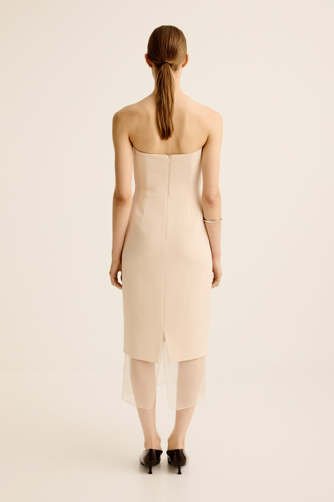 A classic strapless silhouette, reimagined with refined artistry. Featuring a tailored bustier and sheer organza overlay, this piece balances structure and softness - a considered expression of day-to-evening dressing.