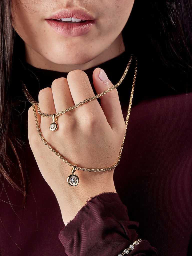 Refined in weight and classic in silhouette, the Olivia Bond 18ct Yellow Gold Heavy Trace Necklace is a timeless foundation piece for any fine jewelry collection. Crafted from solid 18ct yellow gold, its bold trace link design offers a luxurious sense of substance and shine. Available in two lengths, this versatile chain can be worn alone for understated impact or layered for a modern statement—effortless, enduring, and quietly powerful.