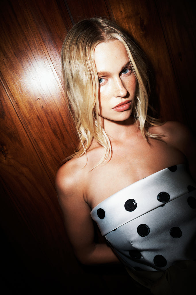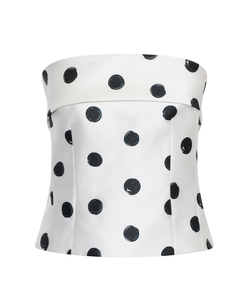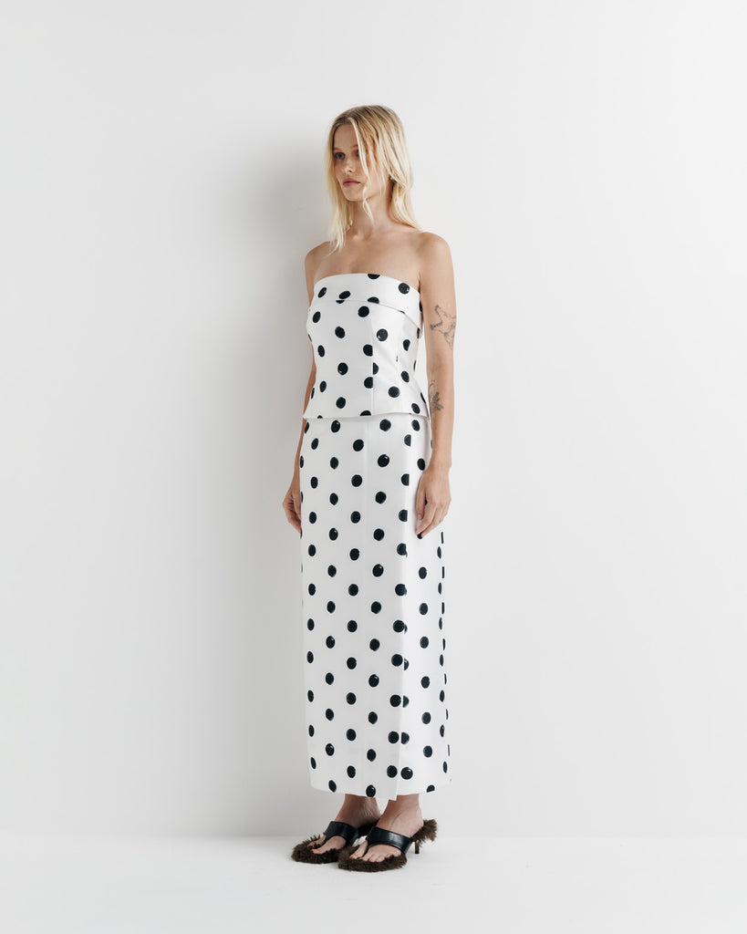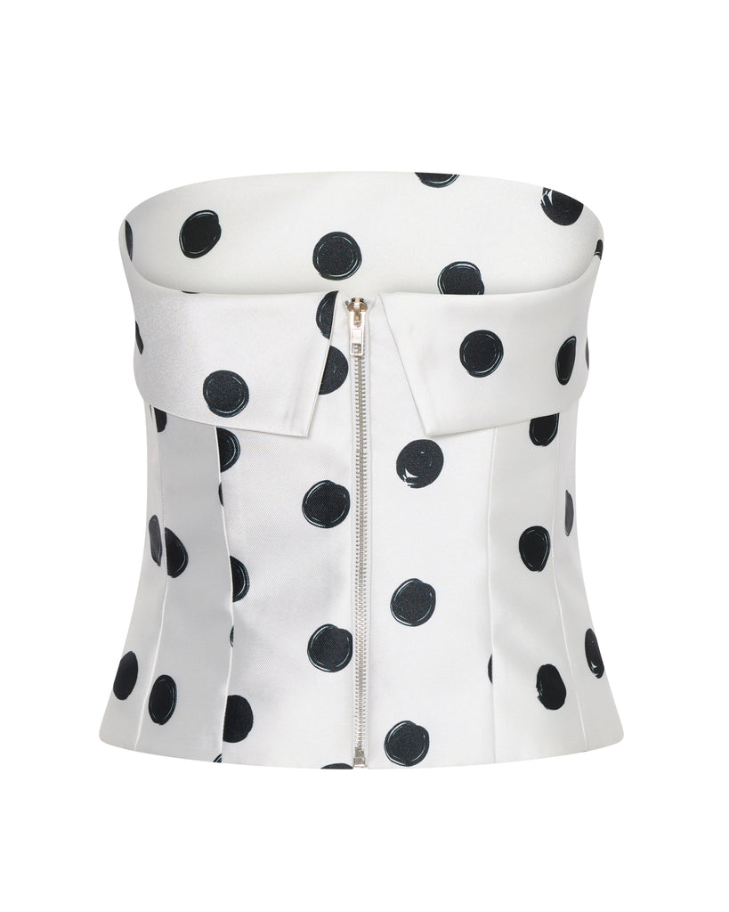 Structured and sculptural, the Aimee Bustier by ROMY is a strapless, form-fitting piece designed to contour the body. Featuring an exposed metal zip closure at the back and clean architectural lines, it balances strength and softness with a modern edge. Originally created in collaboration with artist Anne Marie Jackson, this piece reflects ROMY’s considered approach to feminine tailoring.