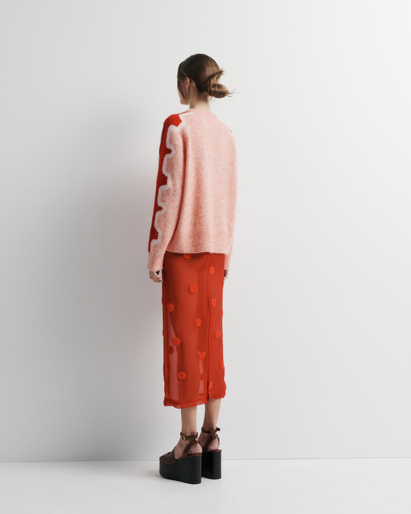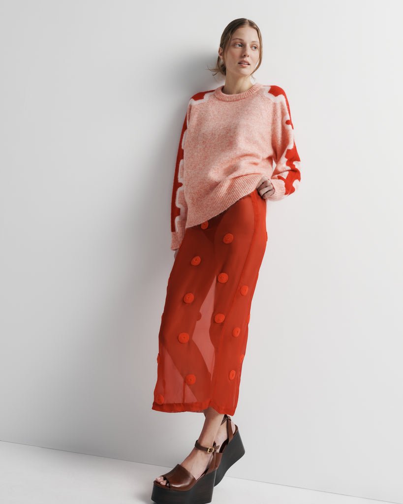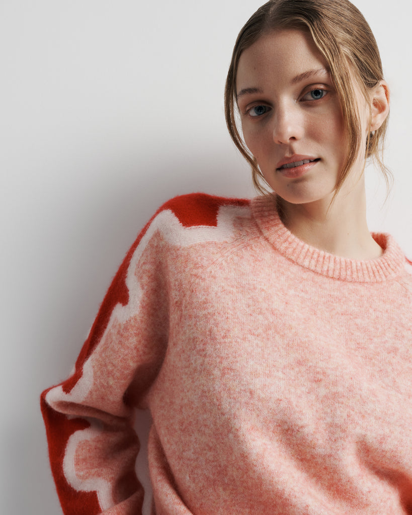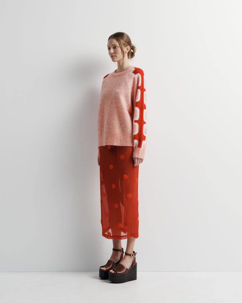 A study in texture and quiet strength, the Avery Sweater by ROMY is a relaxed crew-neck knit rendered in a soft mohair blend. Featuring a ritual motif across the sleeve, it embodies the brand’s subtle balance of artistry and ease.