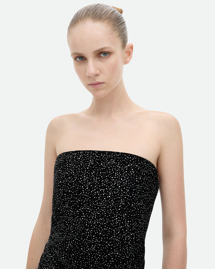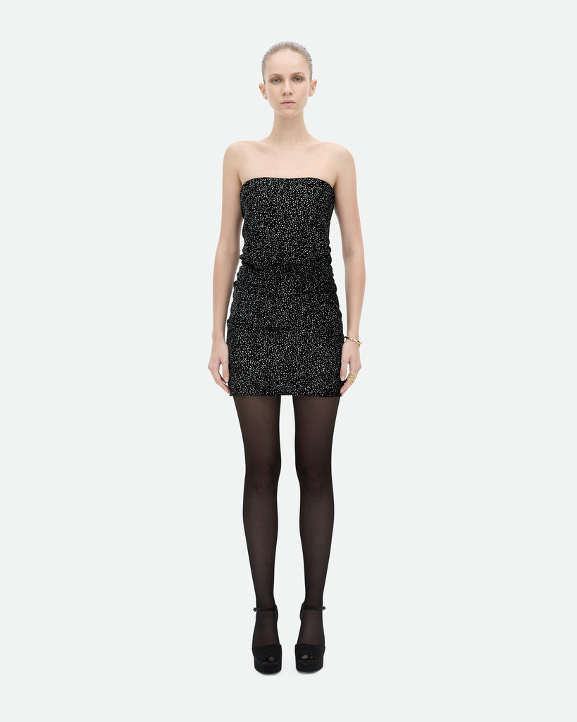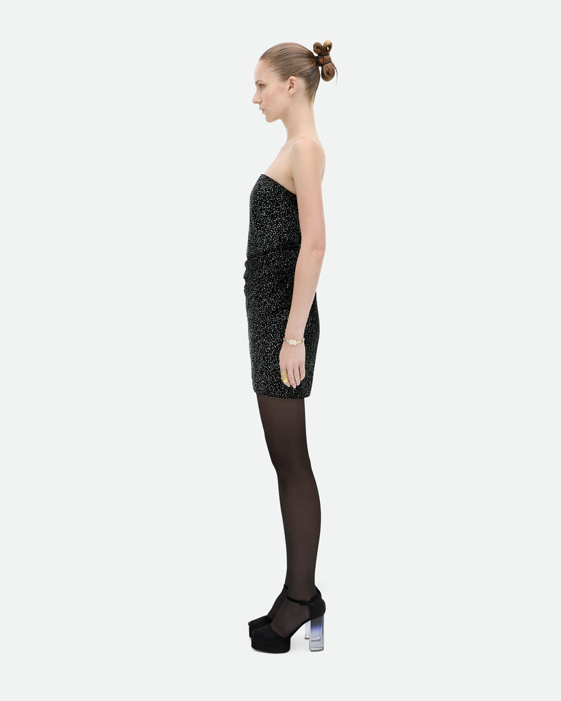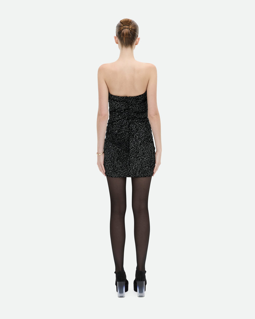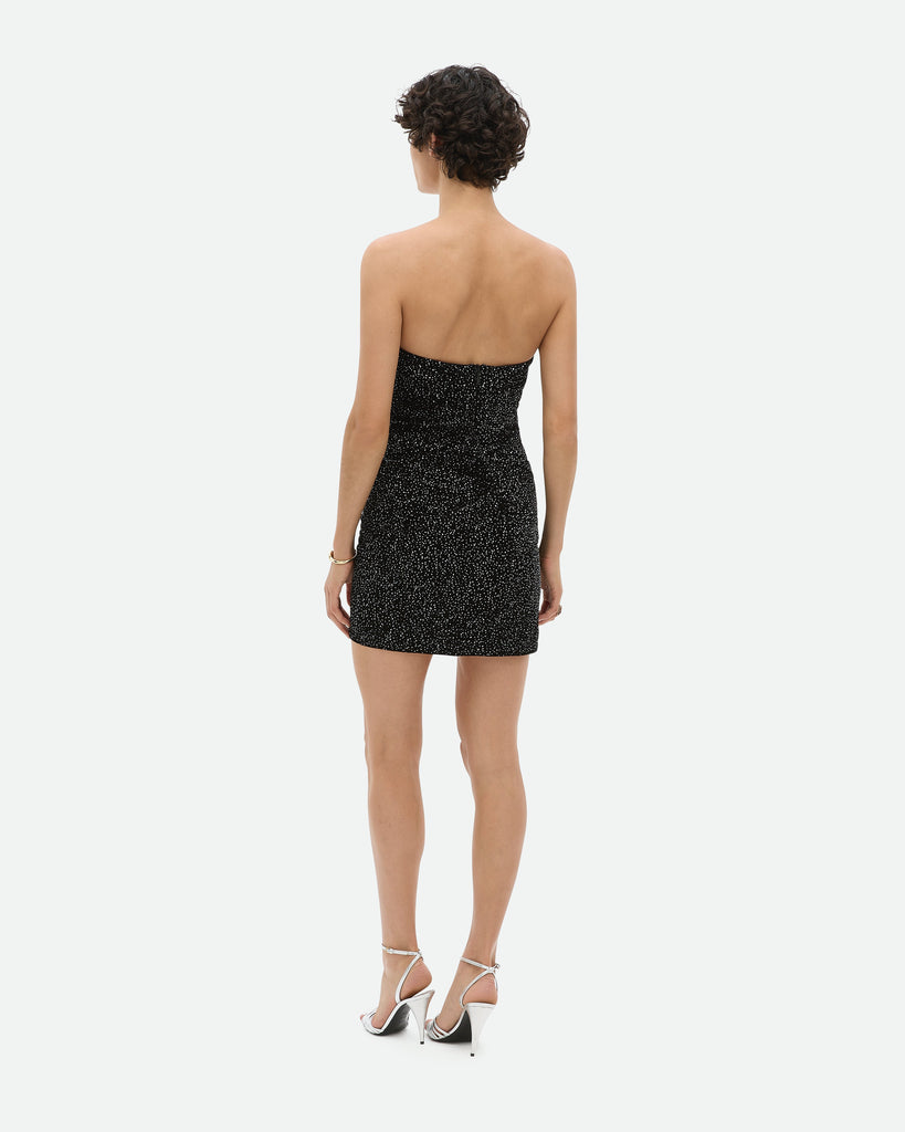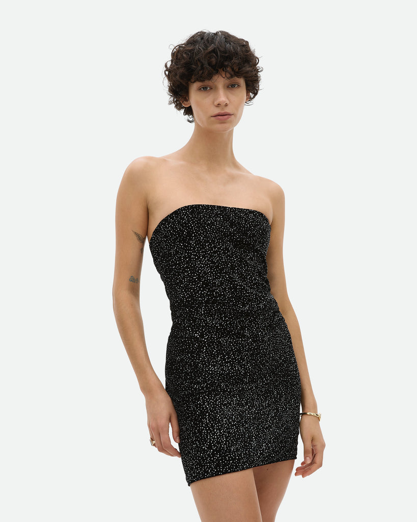 A captivating silhouette in night’s embrace, the Intoxicate Dress is a bold statement of elegance and artistry. Crafted from a silk–velvet blend in deep jet black, its surface shimmers like the night sky, scattered with delicate diamanté embellishments. The strapless, sculpted bodice gracefully folds into a fitted mini length, sculpting a refined yet daring look for evening moments that demand allure.