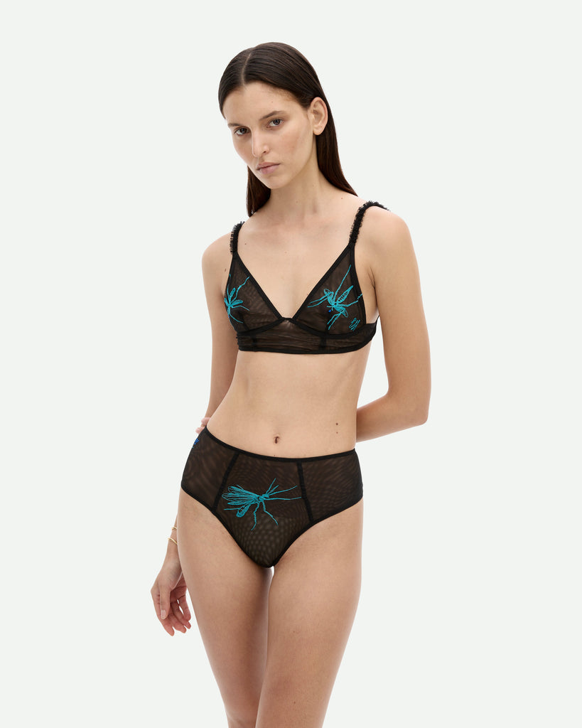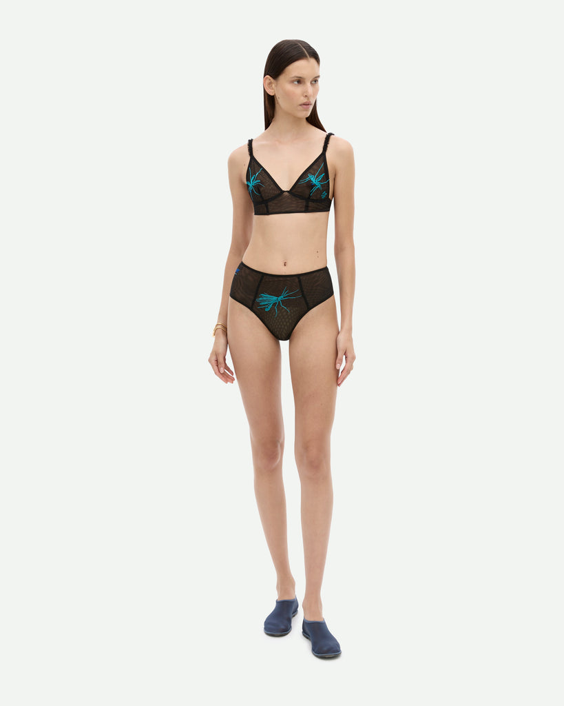 Darkly romantic and sharply detailed, the Mosquito Bite Underwear in Jet Black explores intimacy with a quiet sting. Crafted from stretch mesh milled and embroidered in Paris at Maison Hurel, the set features custom mosquito artwork and archival brand marks from CH and 1971. Tightly ruched seams and laser-cut ribbons bring sculptural dimension, while a gold-plated clasp shaped like an insect leg anchors the set with signature subversion.