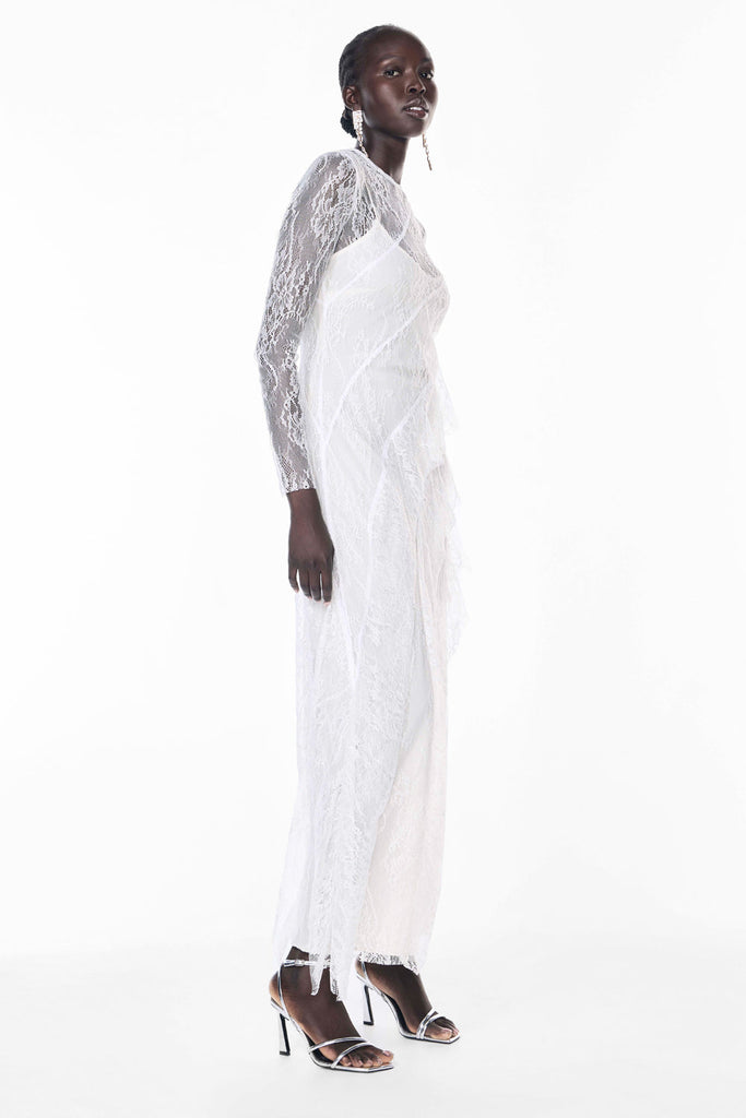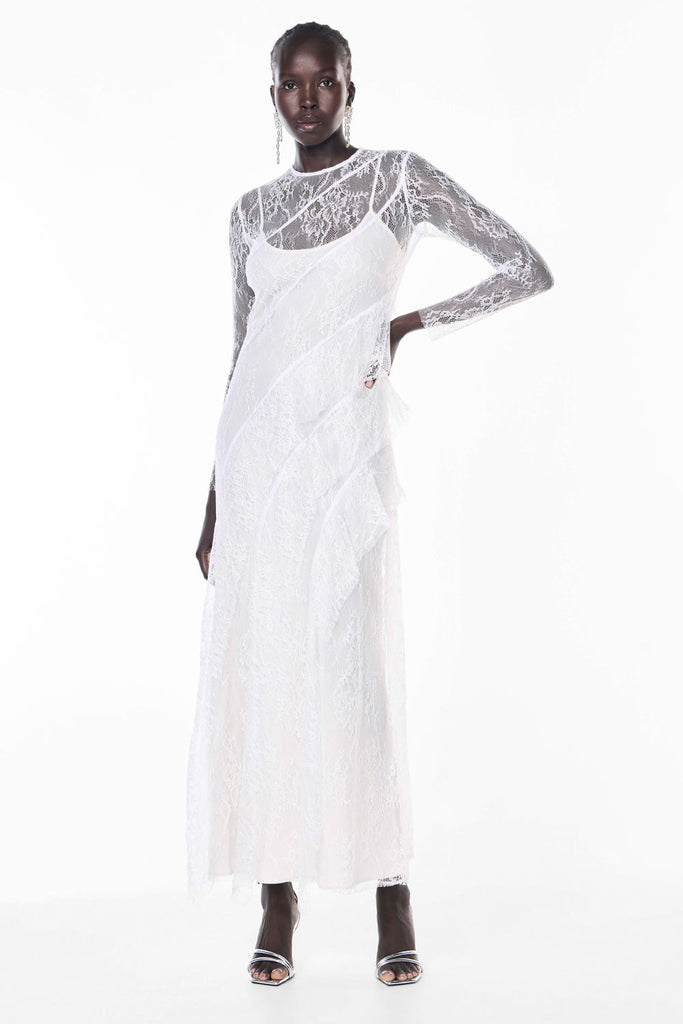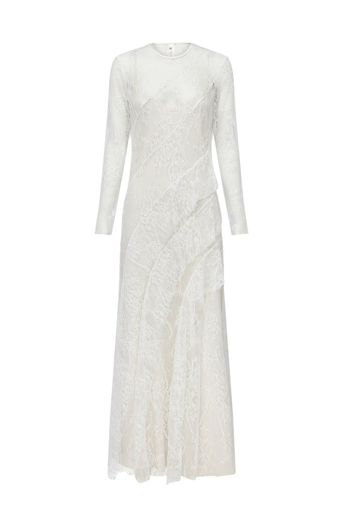 Contrasting skirt in teardrop lace applique for soft movement and visual depth