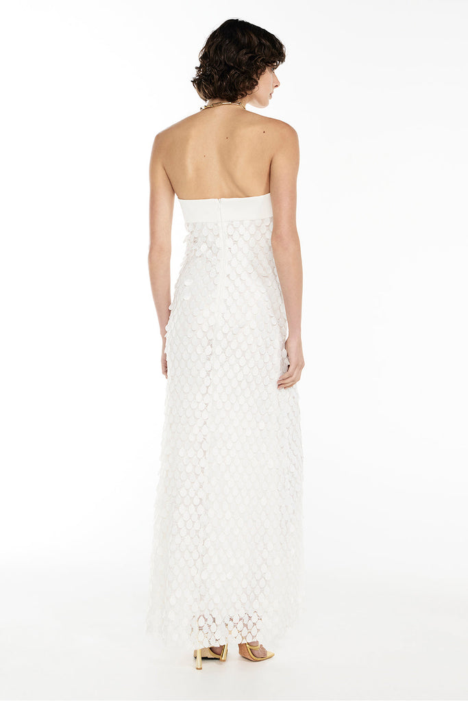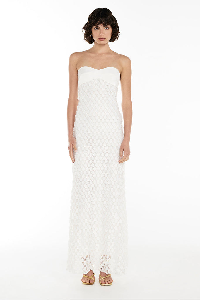 Striking in silhouette and rich in texture, the Supreme Extreme Balconette Dress is a bold expression of modern romance. The structured crepe satin bodice features a flattering balconette neckline that sculpts the form, while the skirt falls into delicate teardrop lace applique offering a contrast of strength and softness. Designed for moments that demand presence, this dress balances feminine detail with architectural precision.