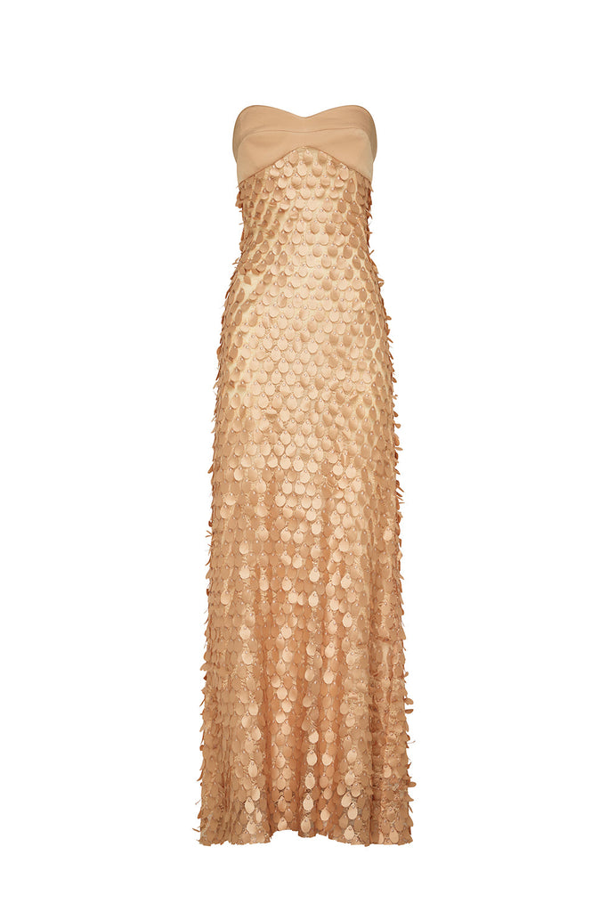 A new colour way in the best selling Supreme Extreme Balconette. The Supreme Extreme Balconette Dress in Honeycomb features a crepe satin bodice with a column style skirt featuring iconic MC teardrop lace applique with fine gold foil detailing & a sweetheart neckline. Perfect for your next occasion.