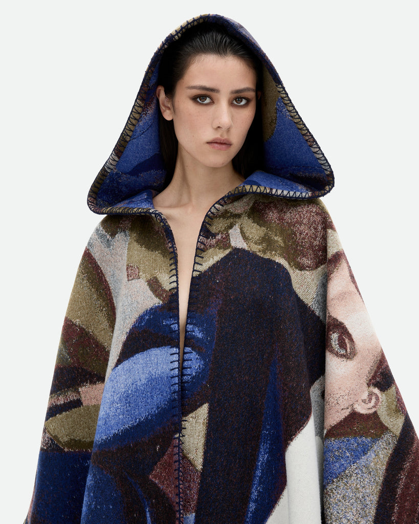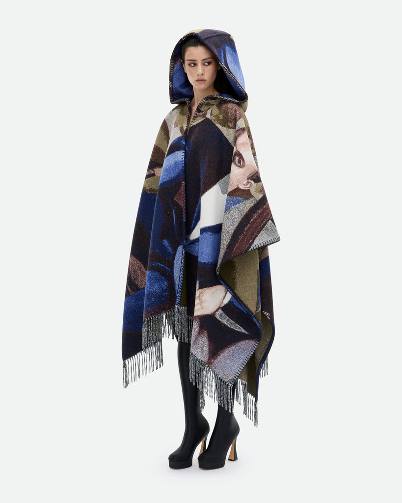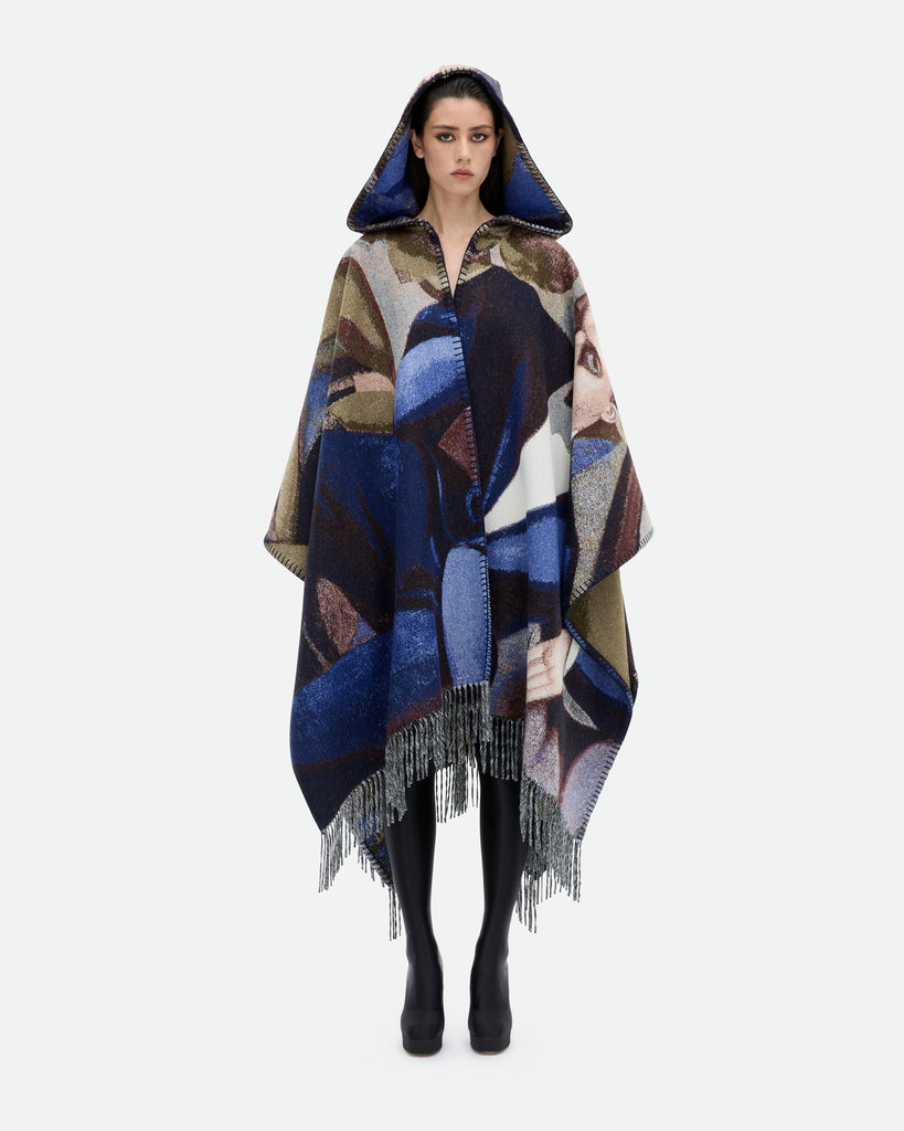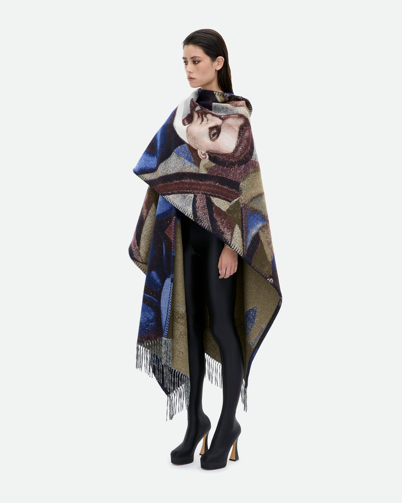 A portrait of decadence in motion, The Marquis Cape drapes art and craftsmanship across the shoulders. Woven from a luxurious cashmere and virgin wool jacquard, it features a custom placement of Tamara de Lempicka’s Portrait of the Marquis d'Afflitto. The fabric produced in Italy by the renowned Piacenza Cashmere mill brings old-world richness to a thoroughly modern silhouette.