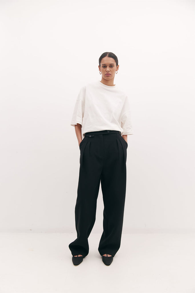 The Adam Trouser is a high-waisted, wide-leg silhouette crafted in bonded suiting with a clean, structured drape. Tapering subtly at the ankle, it features refined tailoring details including double front pleats, a fob pocket, and an extended waistband for a polished finish.