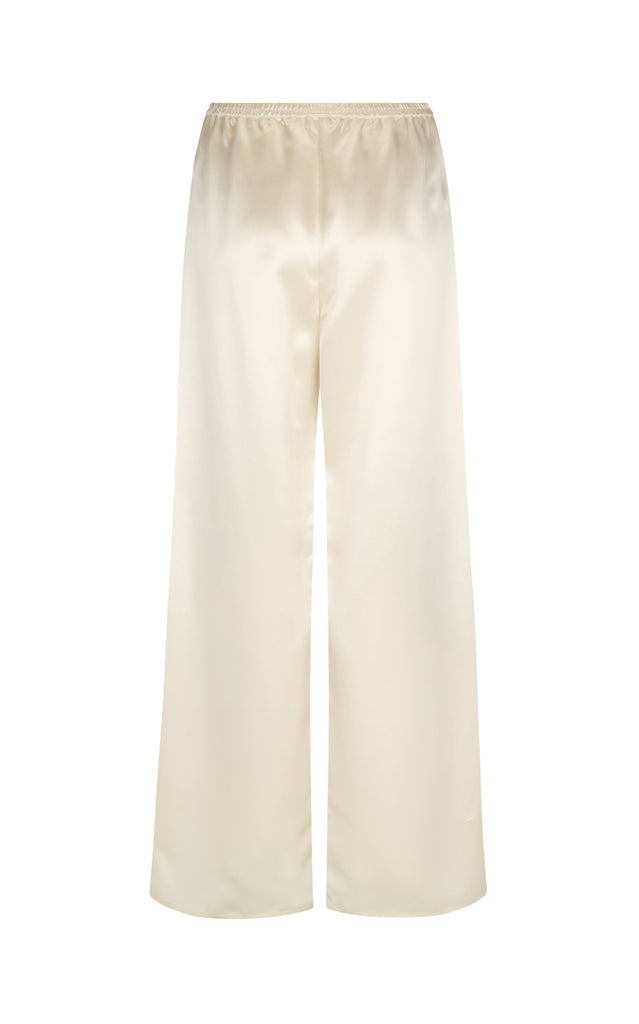 The Irving Trouser in Ivory Satin is a best-selling design, crafted from textured satin with a fluid drape and clean finish. Cut without side seams and falling from a finely elasticated waistband, it offers a smooth, contoured silhouette that lends itself to both structured and relaxed styling.