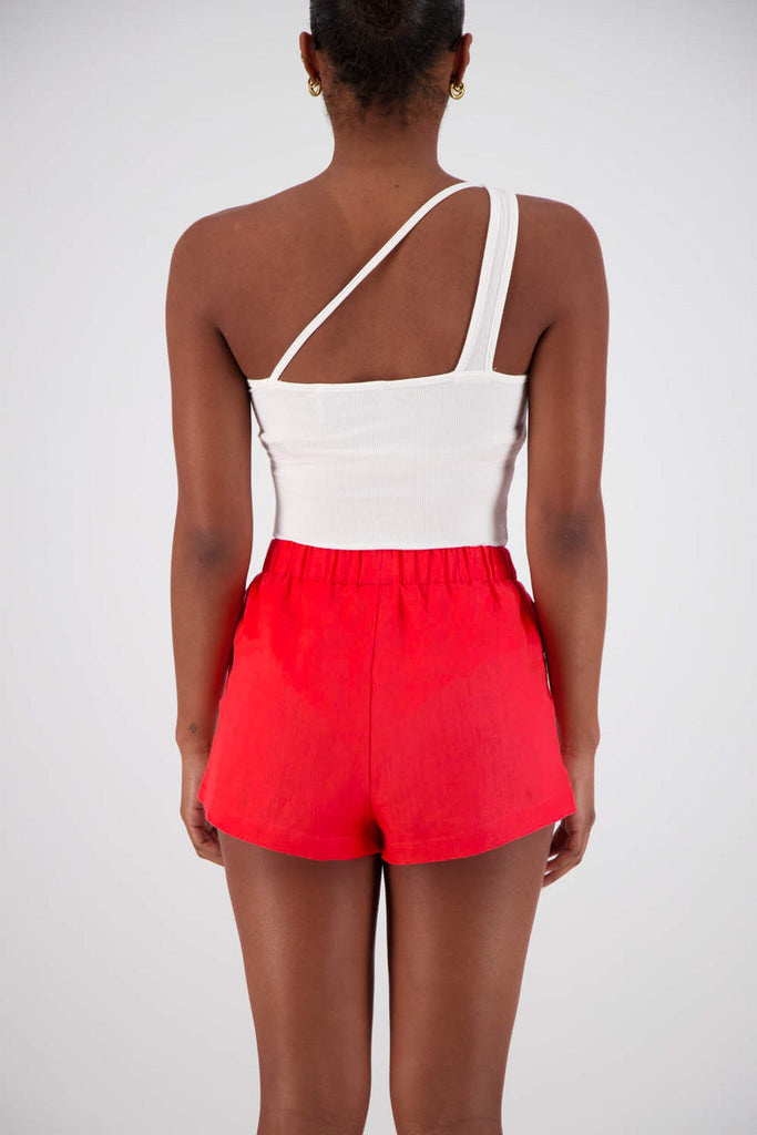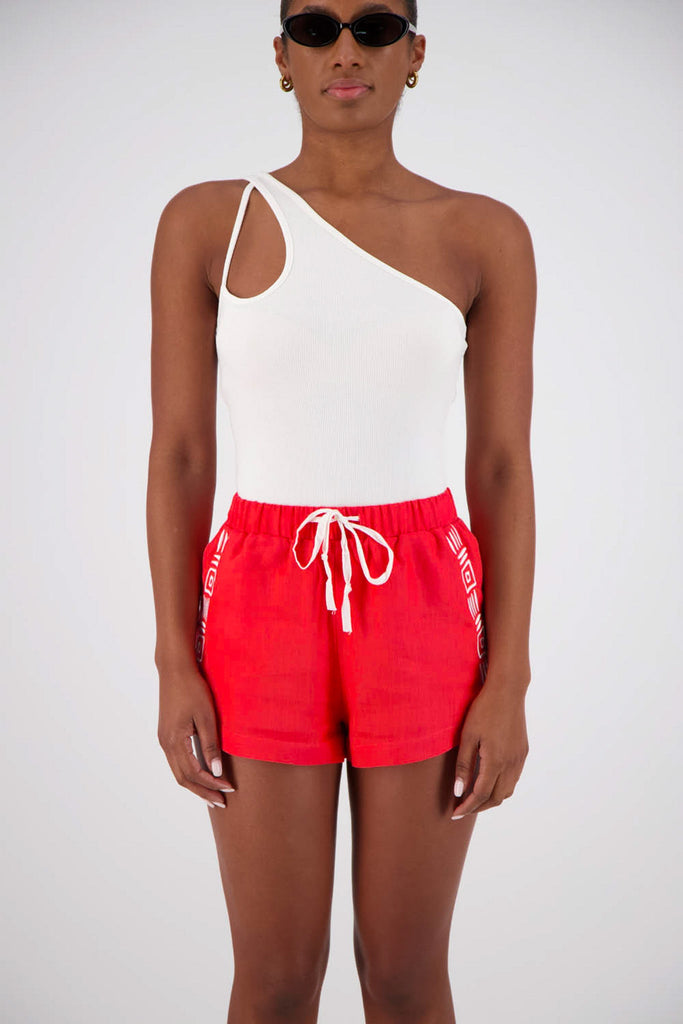 The Rosetta Shorts in Red are a versatile summer staple, combining ease and refinement in a relaxed silhouette. Embroidered detailing and a soft linen blend elevate them for everyday wear.