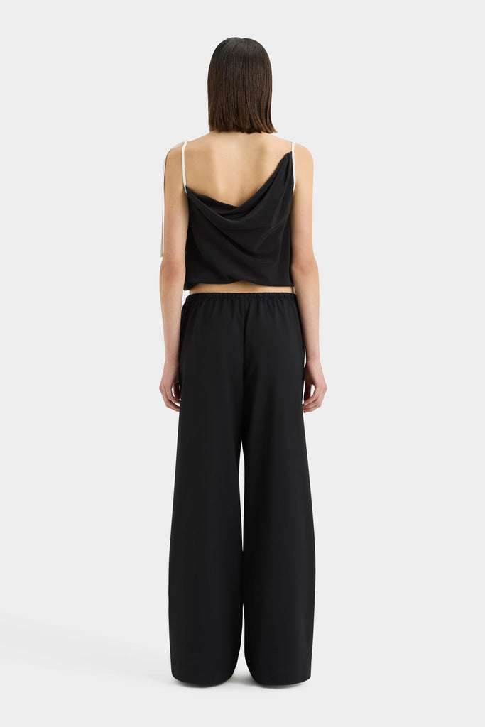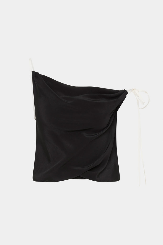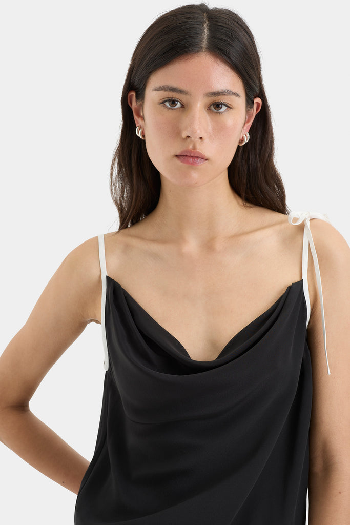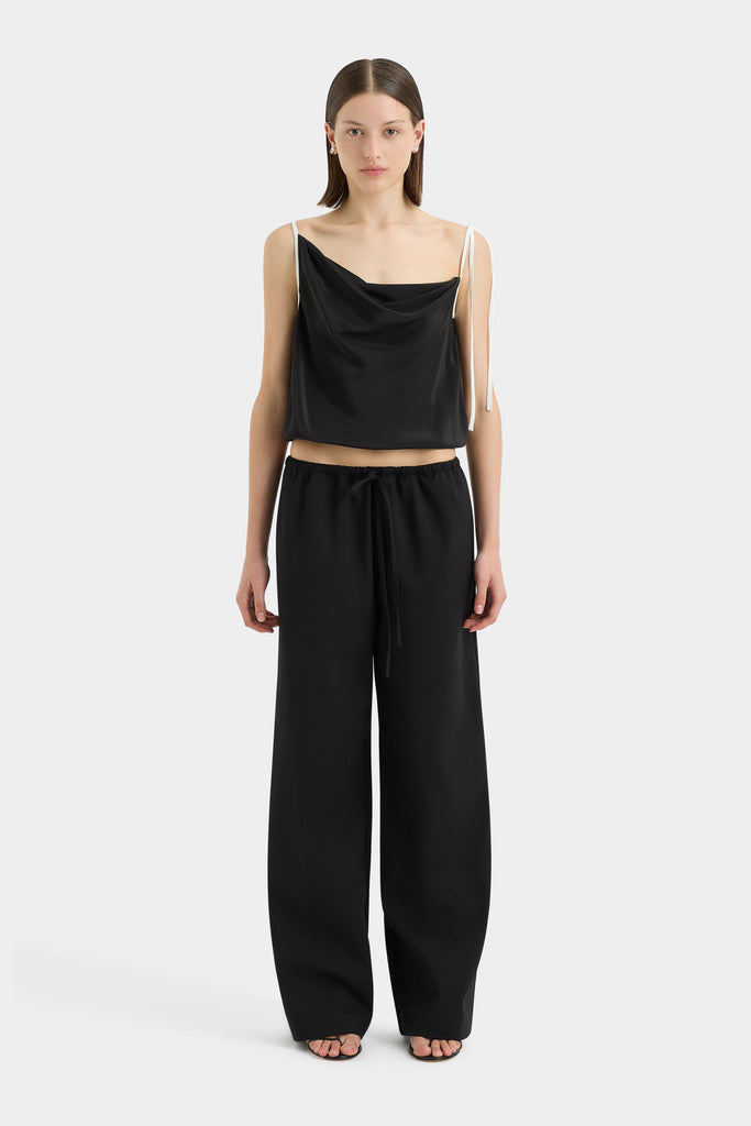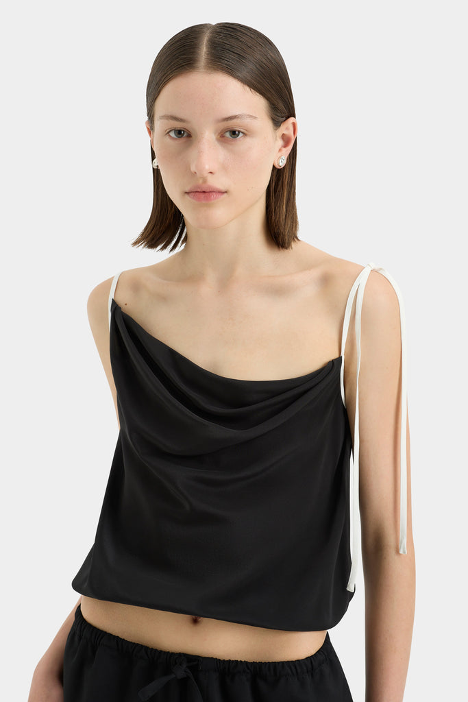 The Adrienne Cami is a relaxed cropped top in lightweight, semi-sheer black silk chiffon. Featuring a cowl neckline, elasticated waistband, and contrasting white shoulder ties.