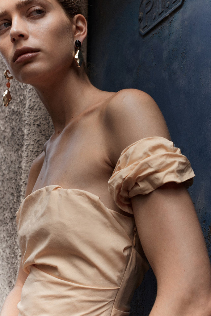 The Carmen Draped Gown in light peach is a floor-length silhouette defined by fluid draping and a soft lustre. Crafted from a stretch fabrication, it combines structure with graceful movement.