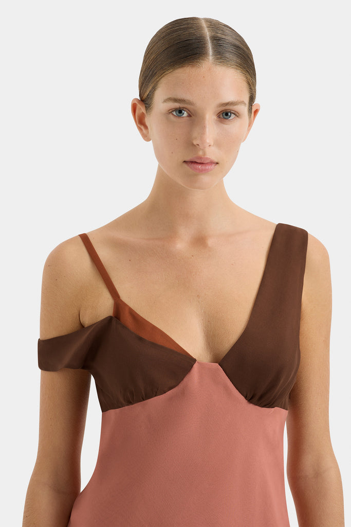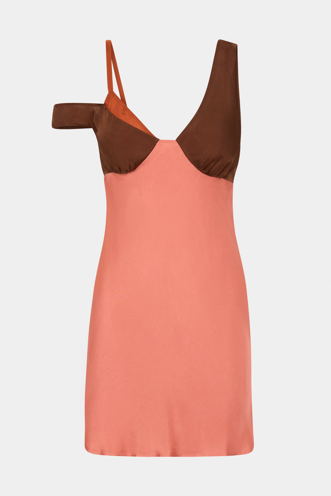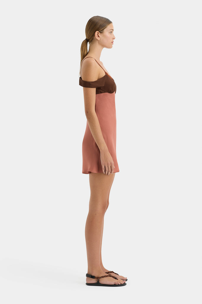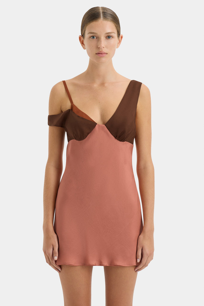 The Halcyon Mini Dress in Almond Spice showcases a playful yet refined design with its colourblock panels and contrast babylock detailing. Featuring a fixed overlay at the bust and a subtle side front split, the bias-cut silhouette drapes beautifully for an effortlessly flattering fit.