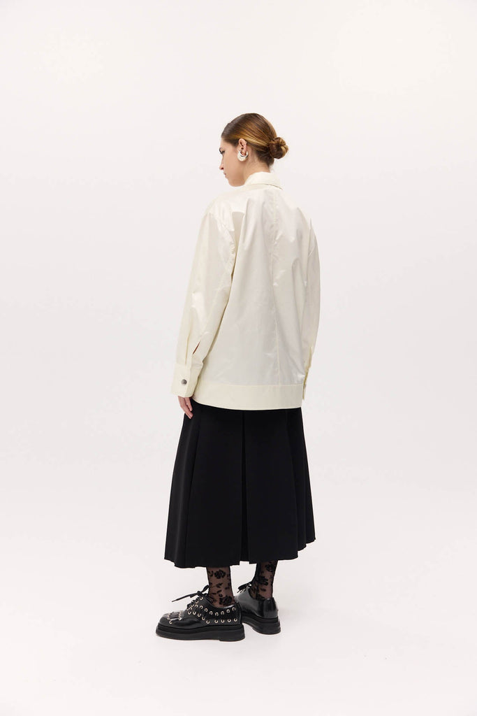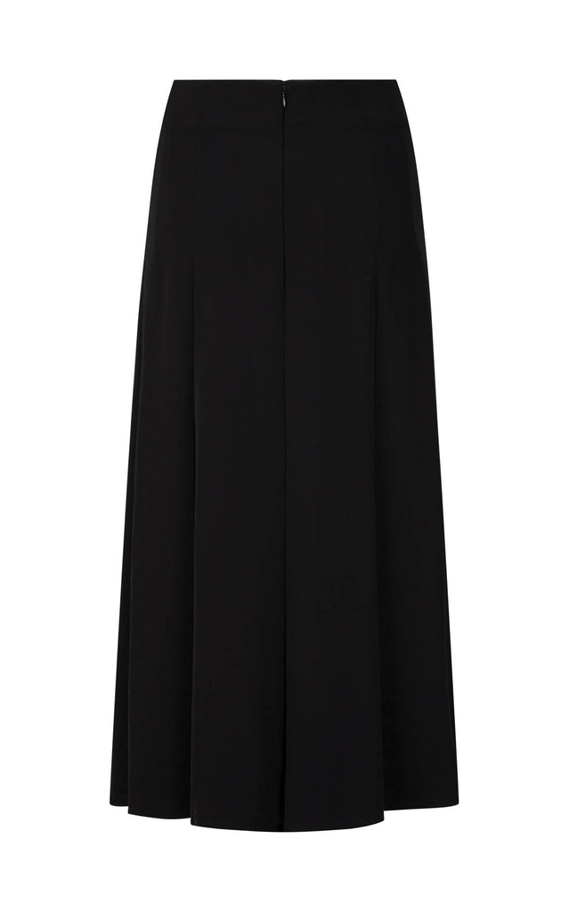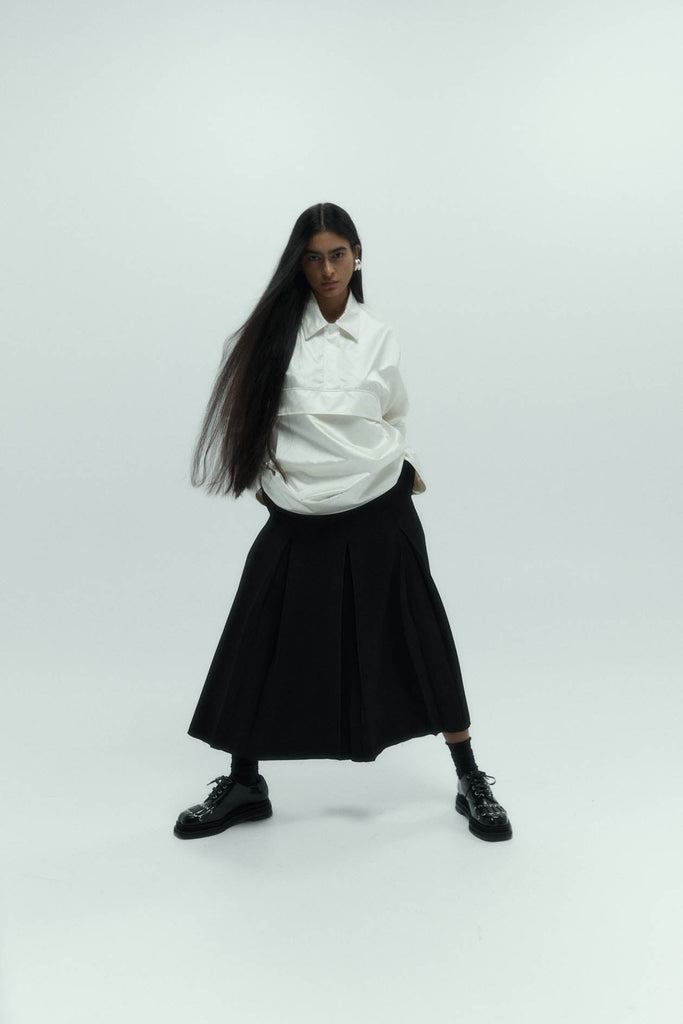 The Ava Skirt in Black is a softly structured silhouette crafted from fluid drape suiting. Tailored with clean lines, it features front pleats that fold gently over the legs, finished with a raw hem and concealed zip for an understated, modern feel.