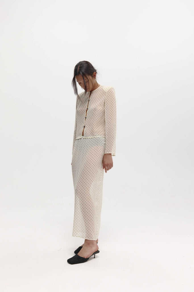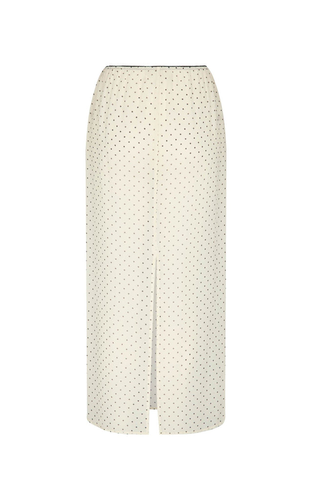Lightweight and fluid, the Camilla Skirt by Harris Tapper is a refined take on feminine dressing. Crafted from 100% silk chiffon in a cream and black polka dot print, it moves effortlessly with the body, offering an ethereal silhouette. Designed to sit at the waist and fall gracefully to the ankle, this piece merges timeless elegance with contemporary ease.
