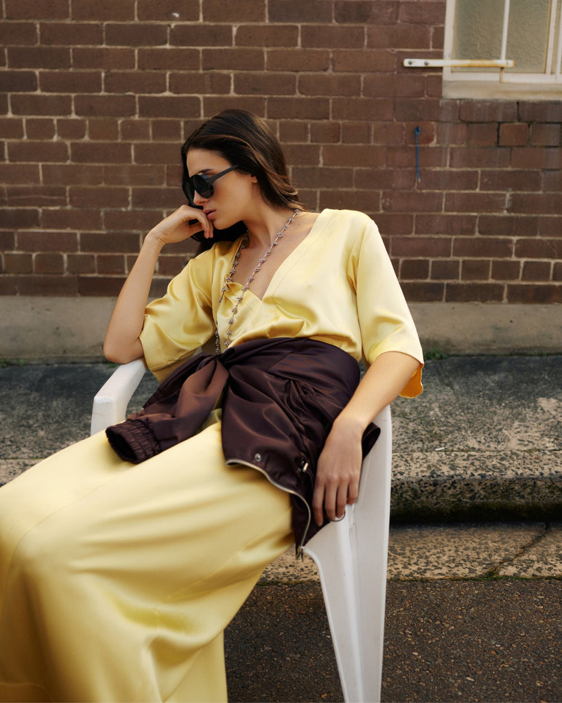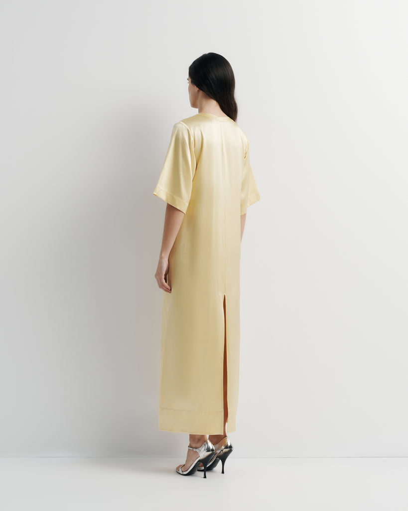 A study in ease and elegance, the Celina Dress evokes soft structure through luxurious silk. Featuring a deep V neckline and flowing sleeves, its silhouette is defined by a detachable tie that brings quiet emphasis to the waist. Ideal for refined daytime dressing or understated evening transitions.