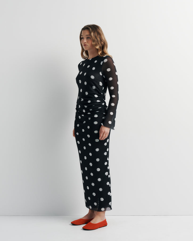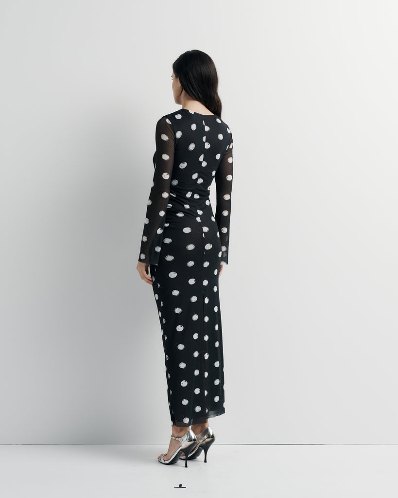 A sculptural balance of transparency and structure, the Clara Mesh Dress by ROMY contours the body with quiet precision. Designed with subtle gathering and bell sleeves, it drapes into a silhouette that feels both elevated and easy—ideal for bridging evening refinement and artful layering.