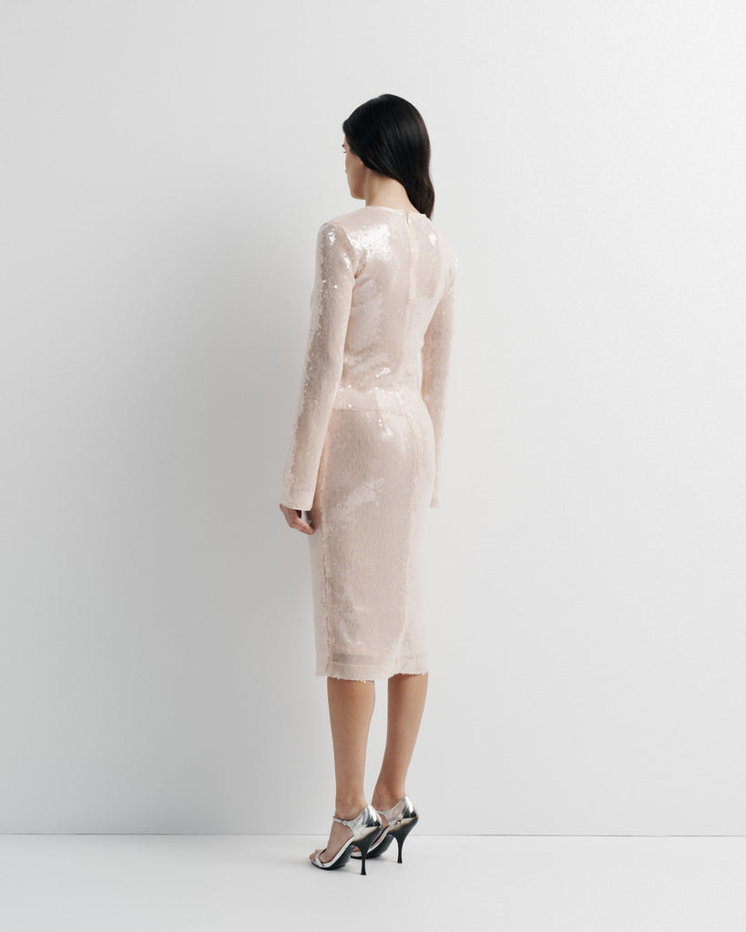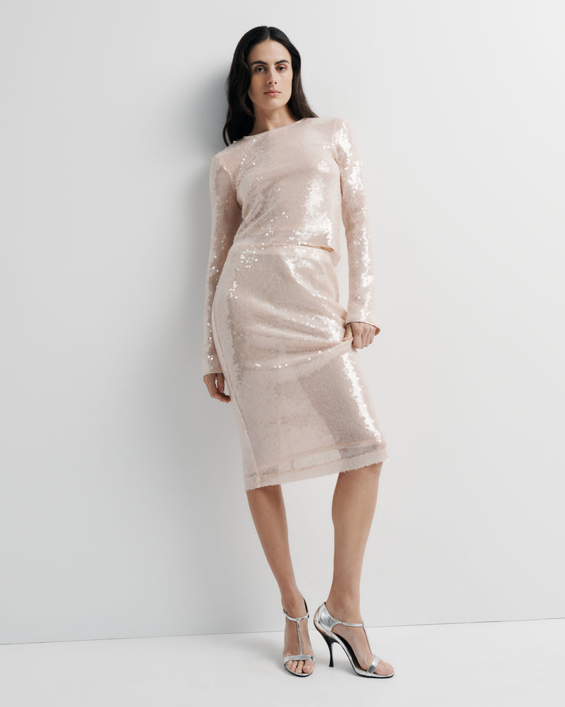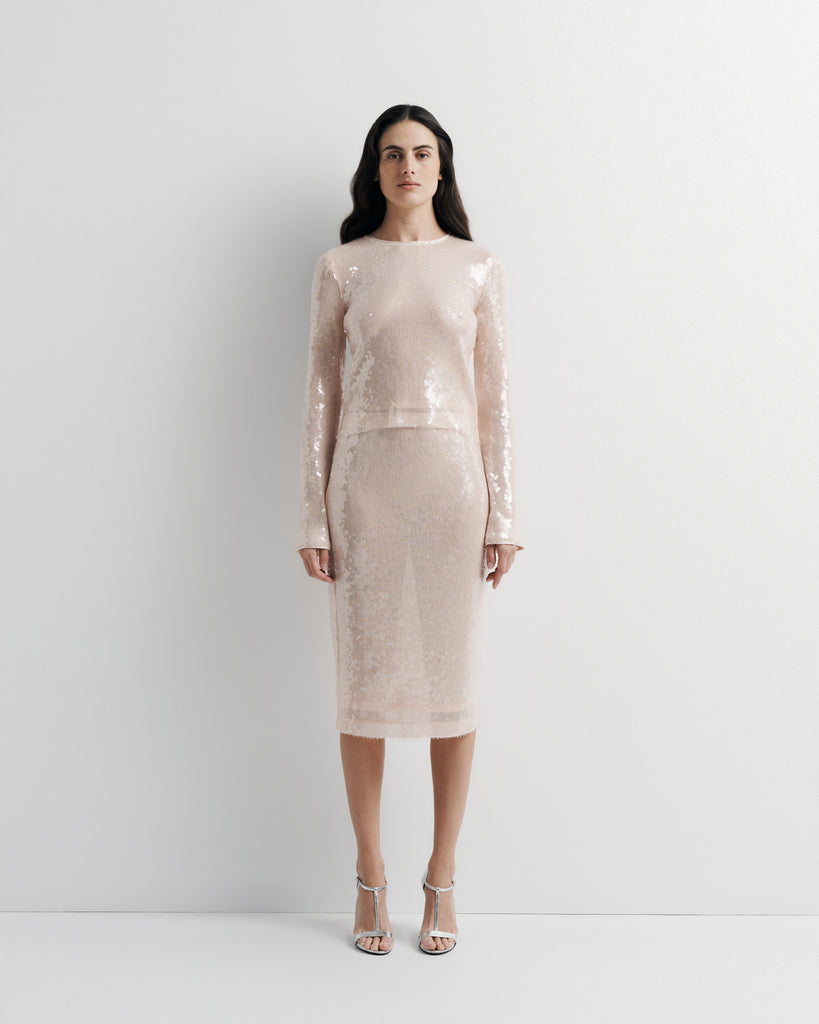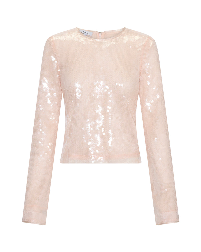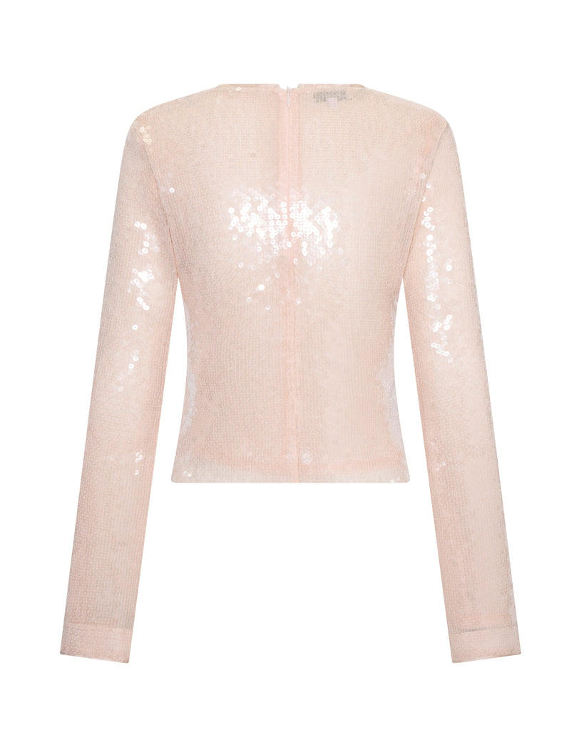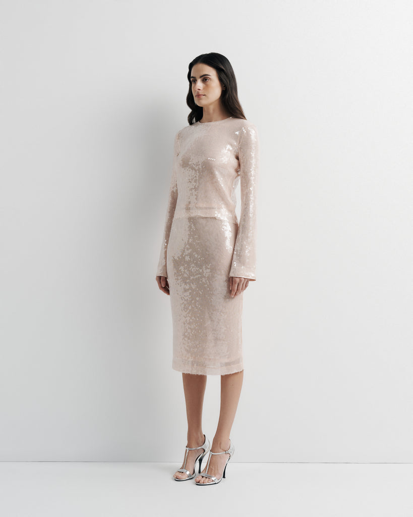 A balance of texture and light, the Sara Top captures a quiet opulence. Sequins catch and soften the light, while bell sleeves and satin piping introduce a sense of movement and control. Designed for evening layering or elevated daywear with a modern edge.