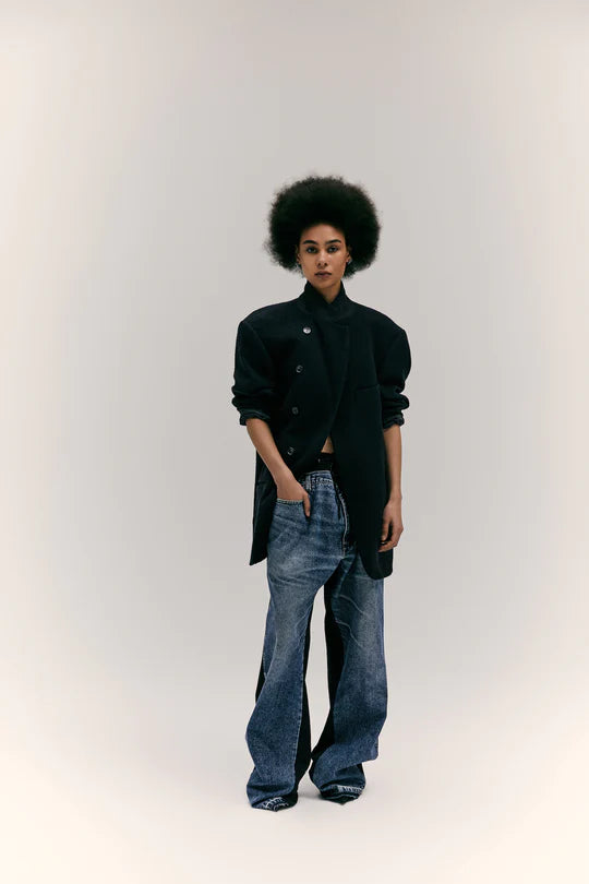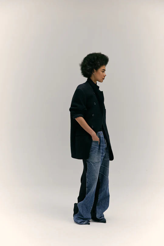 Trousers #11, feature a unisex wide and relaxed fit and are made from up-cycled denim, (grey or blue) on the front and black cotton at the back.