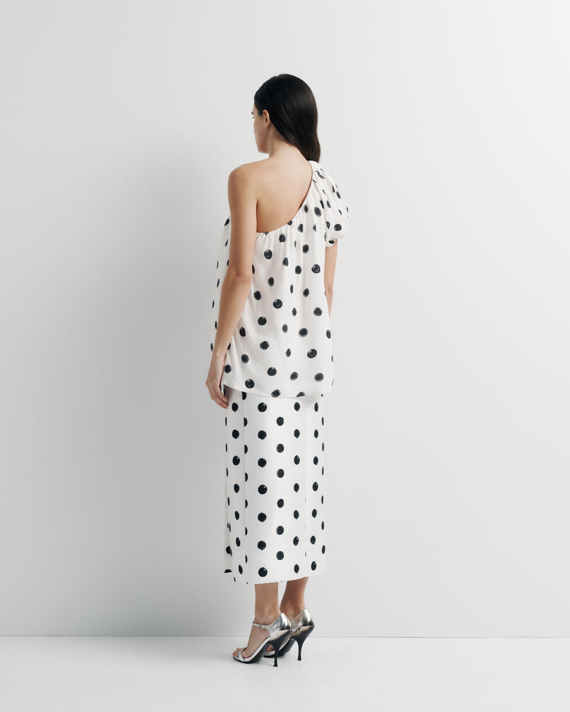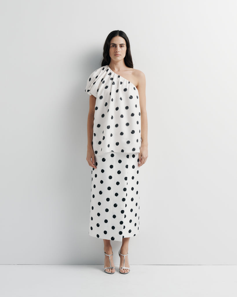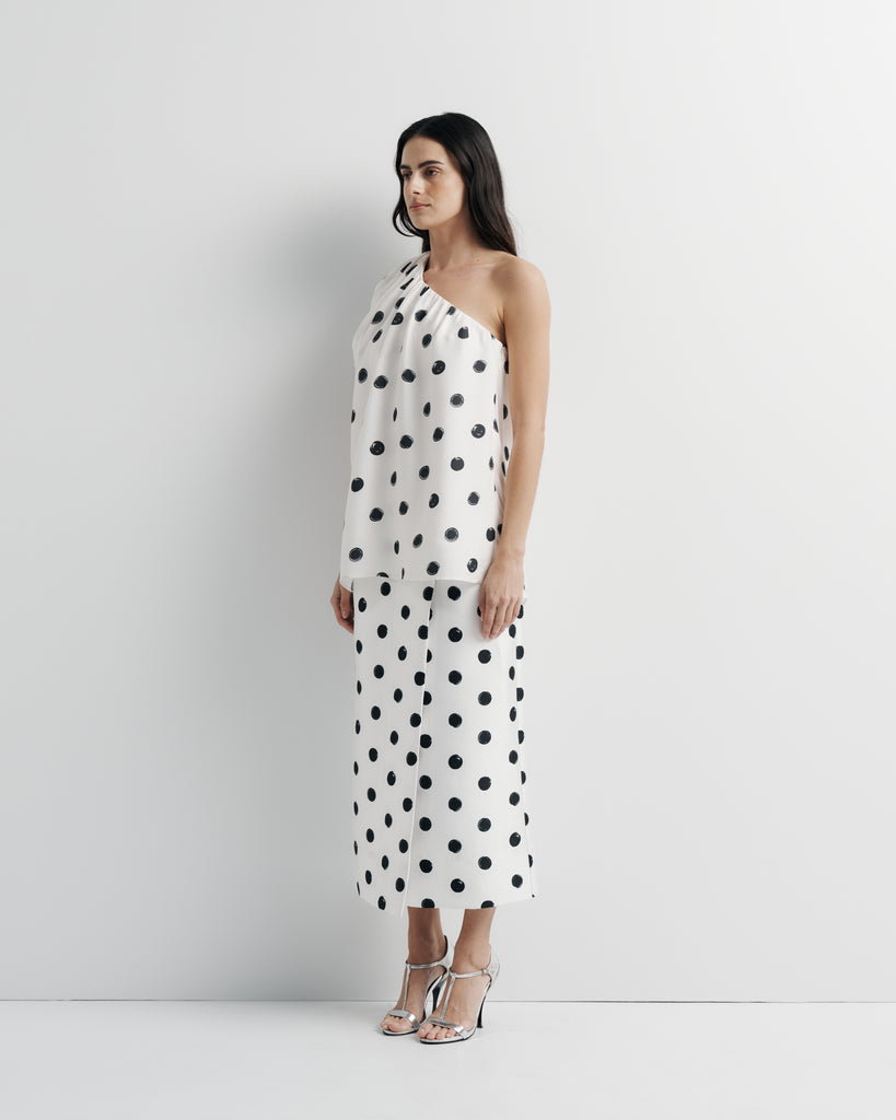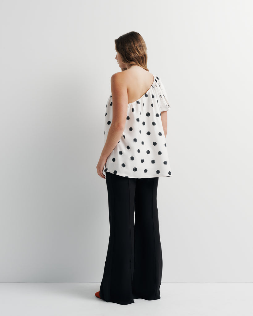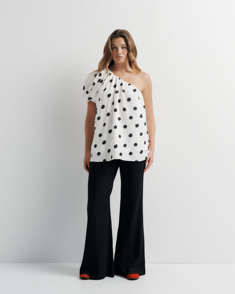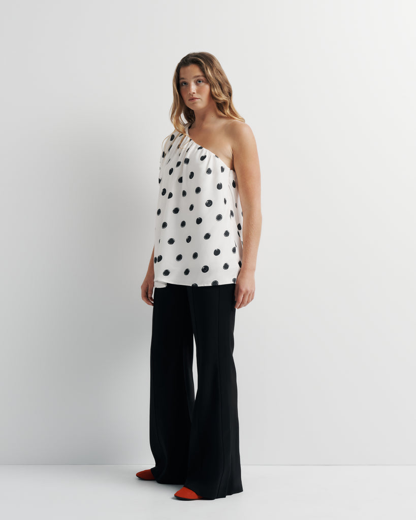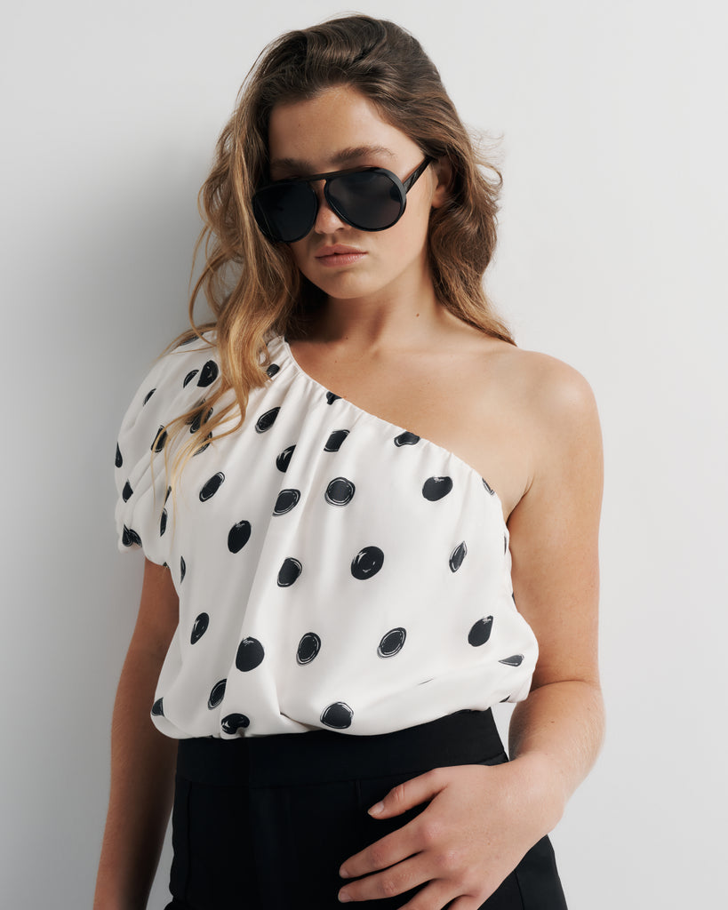 A modern one-shoulder top with sculptural simplicity. The Yasmin Top is designed for a close fit, offering a sleek silhouette that transitions seamlessly from day to evening.
